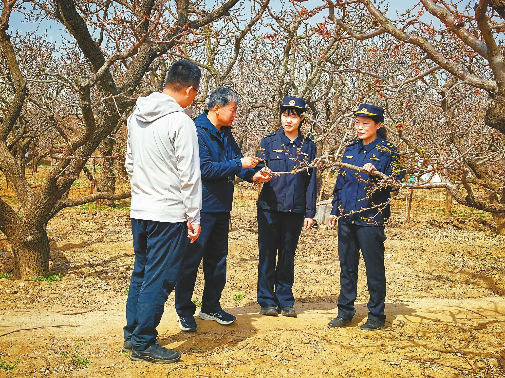 □近日,山东省青岛市城阳区市场监管局工作人员在省市场监管局、市市场监管局指导下,联合农业技术专家深入田间地头,查看城阳区少山红杏萌芽生长情况,围绕地理标志产品保护、种植标准规范、品质提升等进行指导,用实干践行正确政绩观。图为3月31日,该局工作人员在少山红杏种植基地开展地理标志产品保护指导服务。