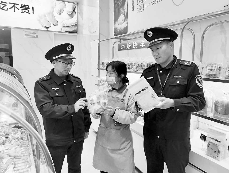 □清明将至,江西省南丰县市场监管局组织对辖区销售的青团、糕点等节令食品经营单位开展全覆盖检查,重点检查主体资质、存放条件、标签标识、食品添加剂使用情况等。图为执法人员对辖区一家烘焙店销售的糕点进行现场检查。 □鄢国卿/摄