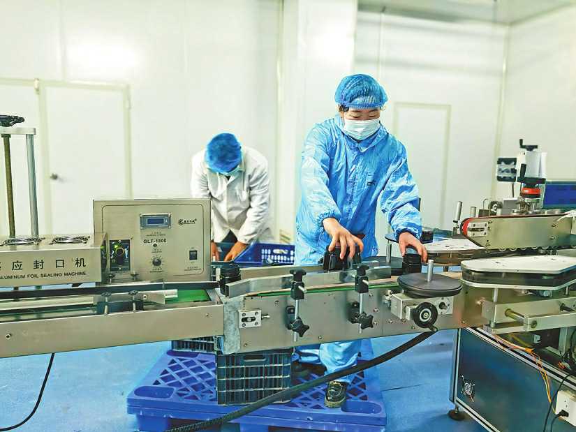 青海省贵德县青蜜蜜蜂良种养殖场工作人员在蜂蜜生产线上检查即将出场的产品。