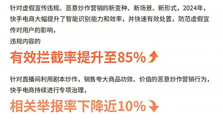 在长期治理打击违规行为方面,快手电商从源头拦截风险商品,前置拦截超5万次,清理不合格商品4万多件;针对不正当营销行为,大幅提升智能识别能力,违规内容有效拦截率达85%,相关举报率下降近10%;还联动警方打击“高价回收”欺诈,保护超10万用户免受损失。知识产权保护方面,新增权利认证近9000个,累计受理侵权投诉26000多起,主动识别并拦截风险商品11万件以上,处置假货商品超2万件,有效维护了市场秩序。