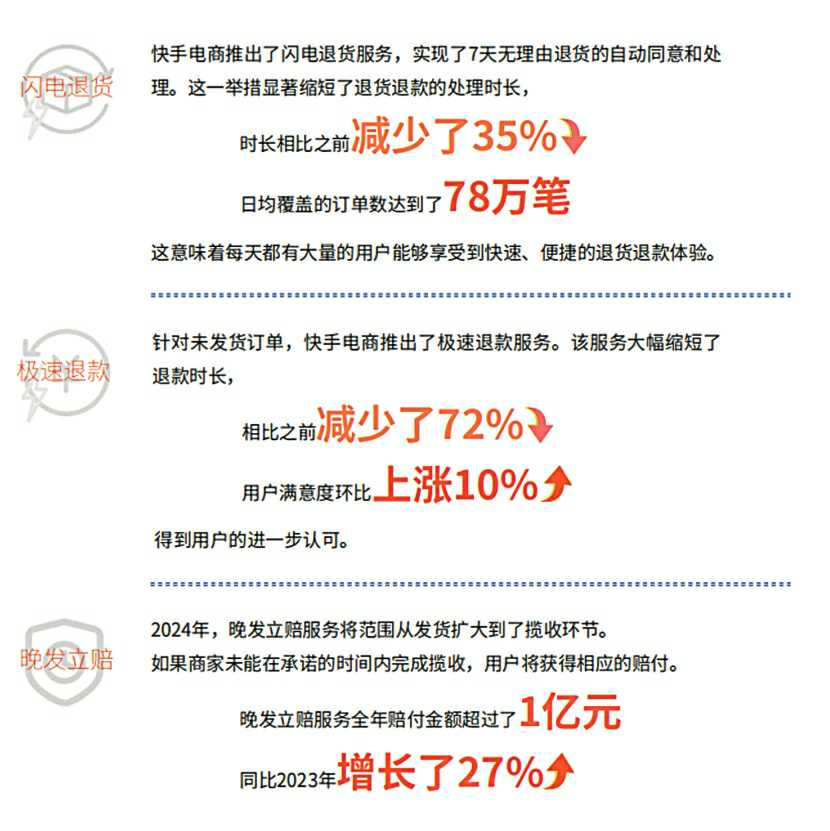 在用户体验方面,快手电商持续在效率与创新两方面发力。并推出了“极速退款”“闪电退货”等服务,将退款时长大幅缩短。其中闪电退货使处理时长减少35%,日均覆盖订单达78万笔;极速退款更是让退款时长锐减72%,用户满意度随之攀升10%。此外,“晚发立赔”服务全年赔付金额超1亿元,同比增27%,赔付范围从发货拓展至揽收环节,全方位保障用户权益。