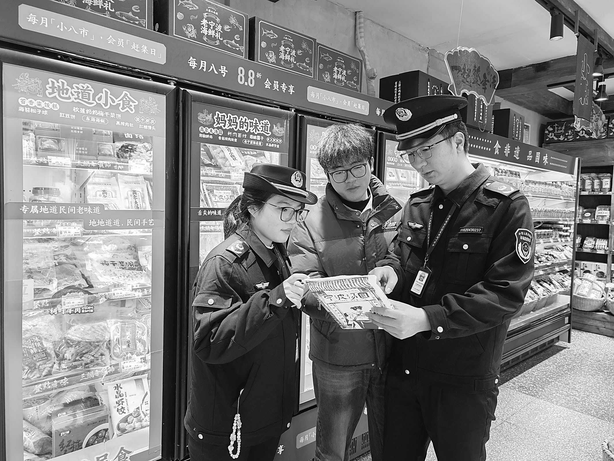 宁波市镇海区市场监管局开展元宵节前食品安全检查。图为二月八日,该局执法人员在一家超市检查汤圆的储存条件、冷藏设施、在售环境温度等情况。 □马律宇/摄