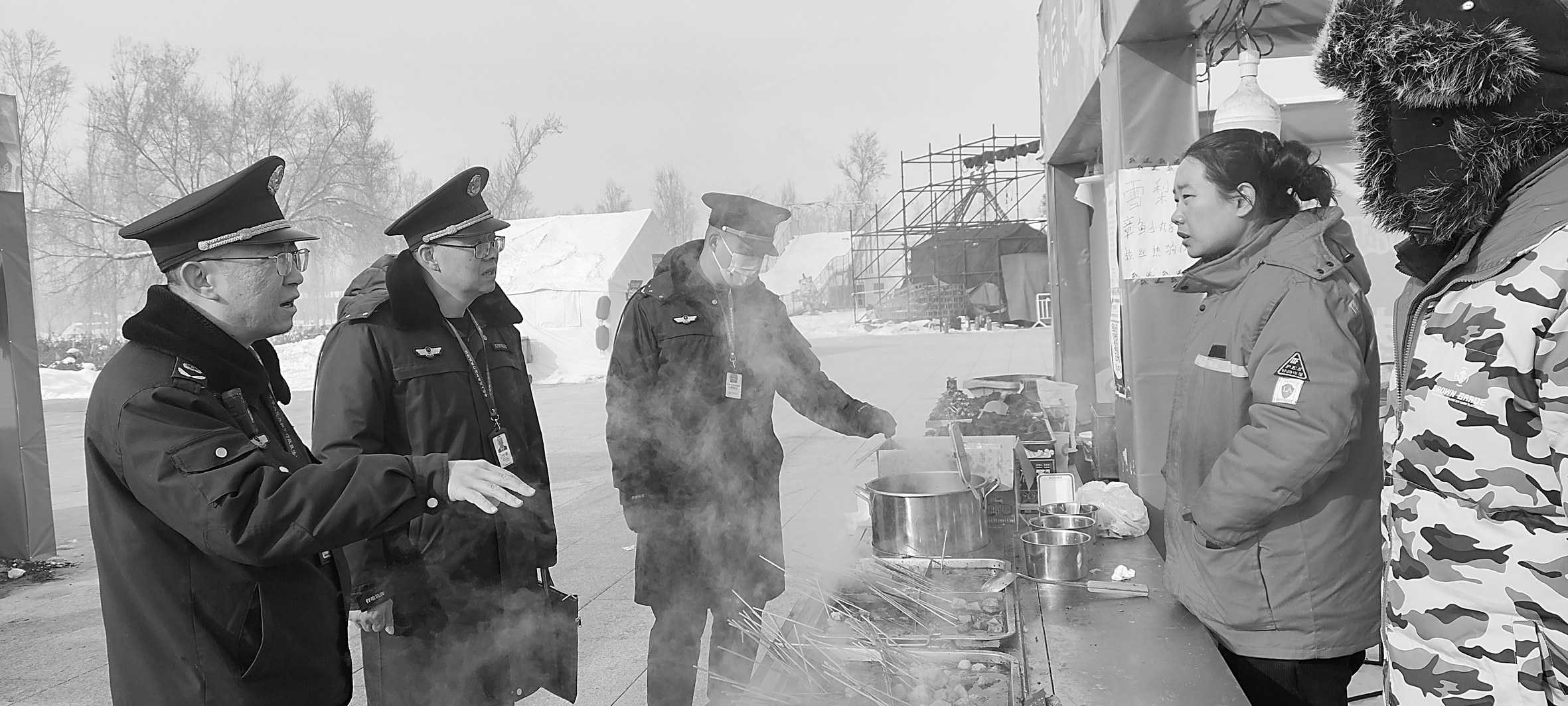 春节期间,新疆生产建设兵团第六师五家渠市市场监管局加强值班值守,做到市场监管不断档、处理消费纠纷更及时,全力守护好市场秩序。图为执法人员正在青格达湖旅游风景区检查食品经营者明码标价等情况。 □吴玲玲 贾雨生/摄影报道