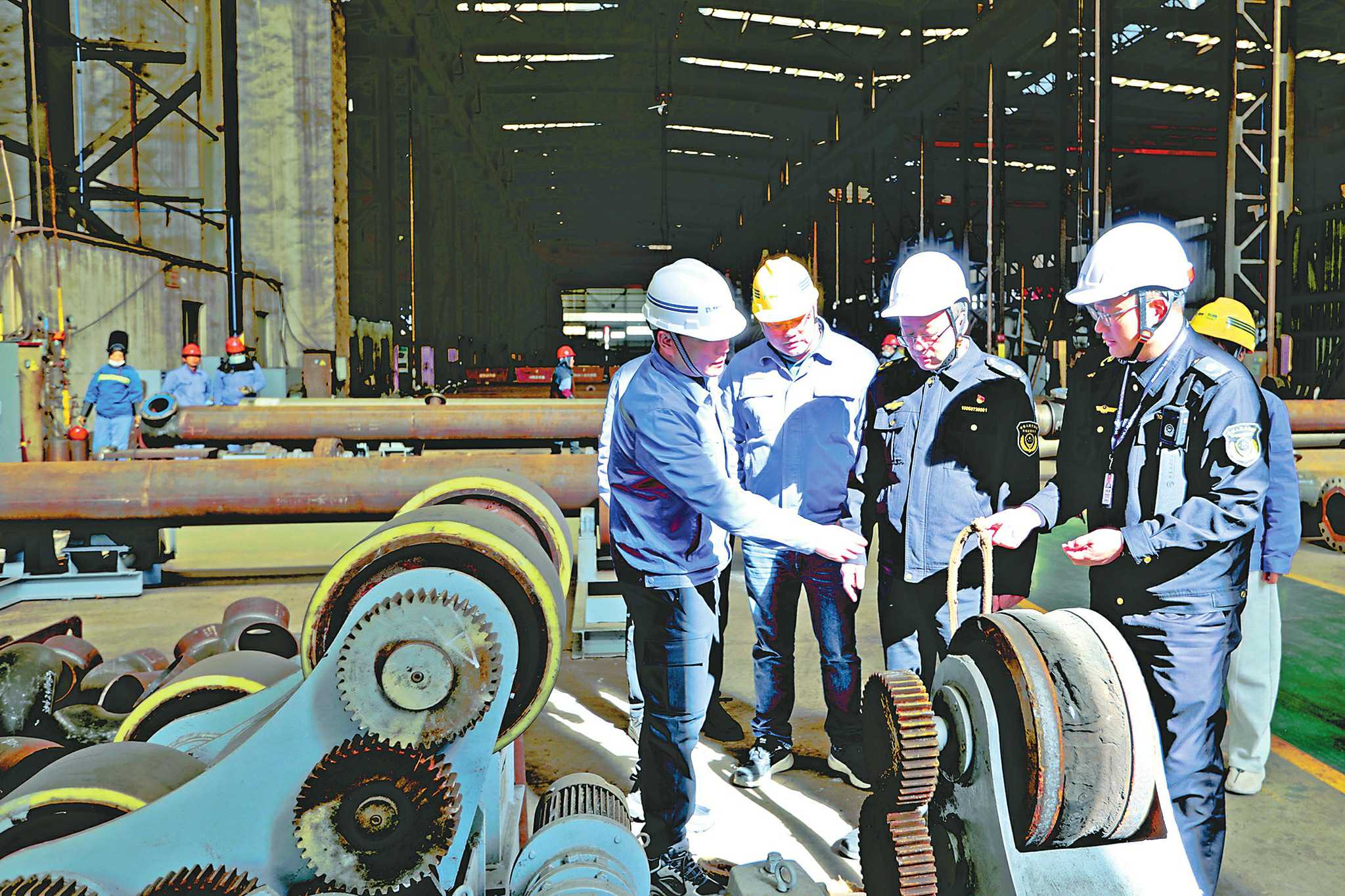 近日,江苏省张家港保税区市场监管局对特种设备生产和使用企业开展“双随机、一公开”检查。图为执法人员在苏州圣汇装备有限公司检查起重机吊具安全情况,确保企业安全生产。 □周 辉/摄