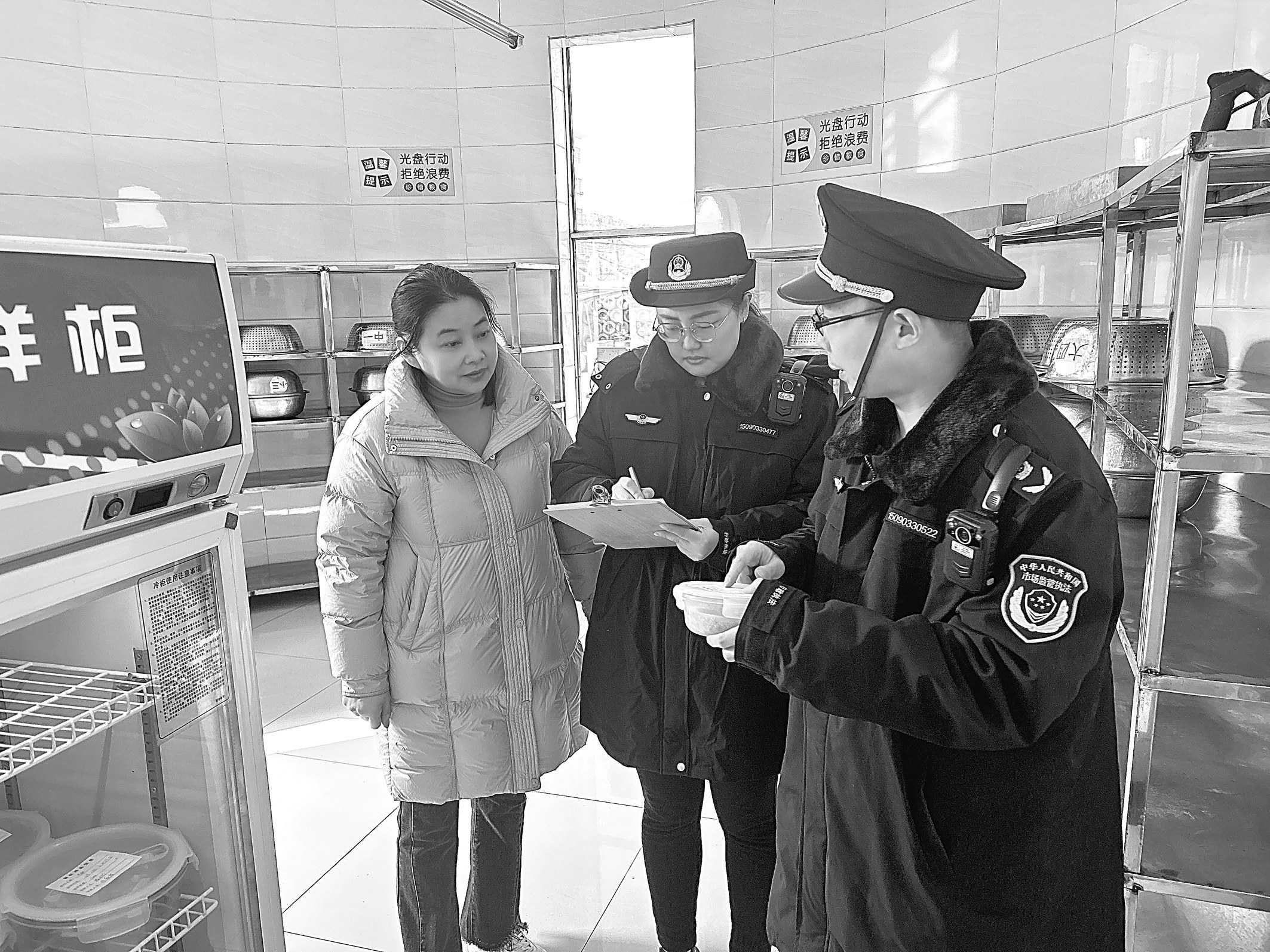 开学以来,山东省宁阳县市场监管局对辖区学校食堂开展食品安全专项检查。执法人员重点检查食材采购、储存、加工流程及从业人员健康管理情况,现场核查食品留样、餐饮具消毒记录,并对后厨环境卫生、食品添加剂使用等环节进行排查,督促学校严格落实食品安全主体责任。图为2月15日,执法人员在一学校食堂进行现场检查。 □何敬华 刘晓伟/摄影报道