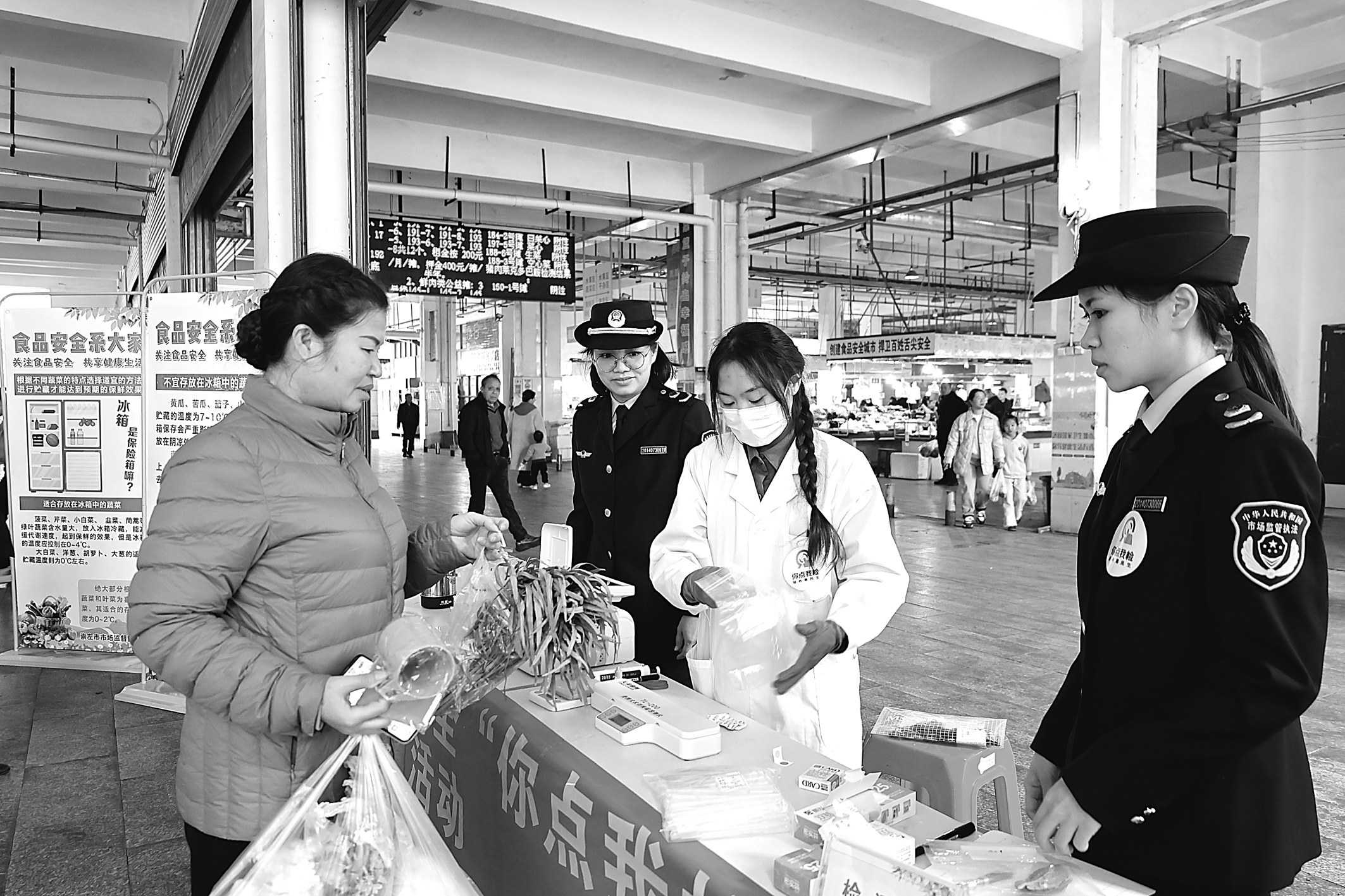 二月十四日,广西壮族自治区崇左市市场监管局在锦绣东方农贸市场开展首个“百姓点检日”活动,旨在拓宽消费者参与食品安全共治共享渠道,切实提升人民群众对食品安全的获得感、幸福感和安全感。图为市民提着刚购买的蔬菜前来检测。 □本报记者 孔国俊 通讯员 李敏/摄影报道