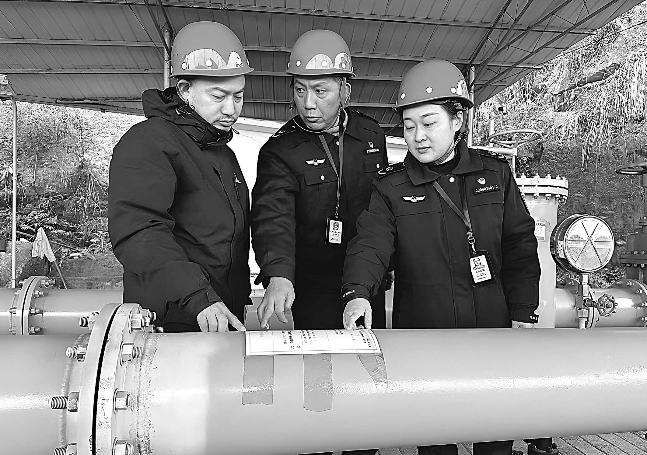 为保障城镇燃气压力管道安全运行,维护人民群众生命财产安全和社会稳定,杜绝燃气压力管道“带病运行”,日前,重庆市涪陵区市场监管局开展燃气压力管道安全专项排查整治,指导企业落实“日管控、周排查、月调度”工作机制,及时消除安全隐患。图为2月14日,执法人员在燃气管道现场检查燃气特种设备使用登记情况。