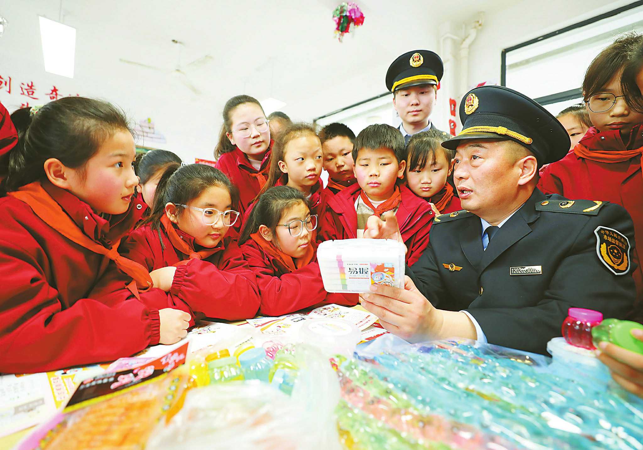 3月13日,安徽省淮北市烈山区市场监管局开展“消费维权进校园”宣传活动,引导学生树立科学、理性、绿色的消费理念。图为该局工作人员在烈山小学为学生讲解食品安全和消费维权知识。 □李 鑫/摄