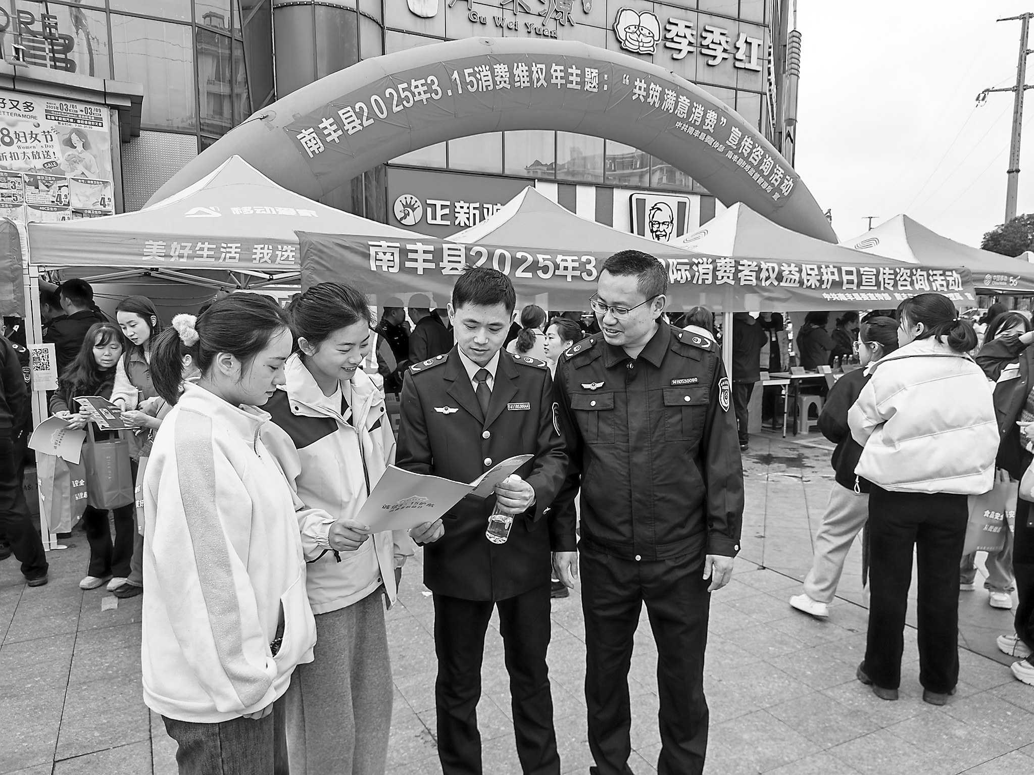 江西省南丰县市场监管局日前联合多家单位开展国际消费者权益日宣传咨询活动。活动现场,工作人员通过发放宣传资料、悬挂条幅、设置展板等方式普及消费维权知识,提高消费者自我保护能力。图为工作人员在向消费者讲解消费维权知识。 □鄢国卿/摄