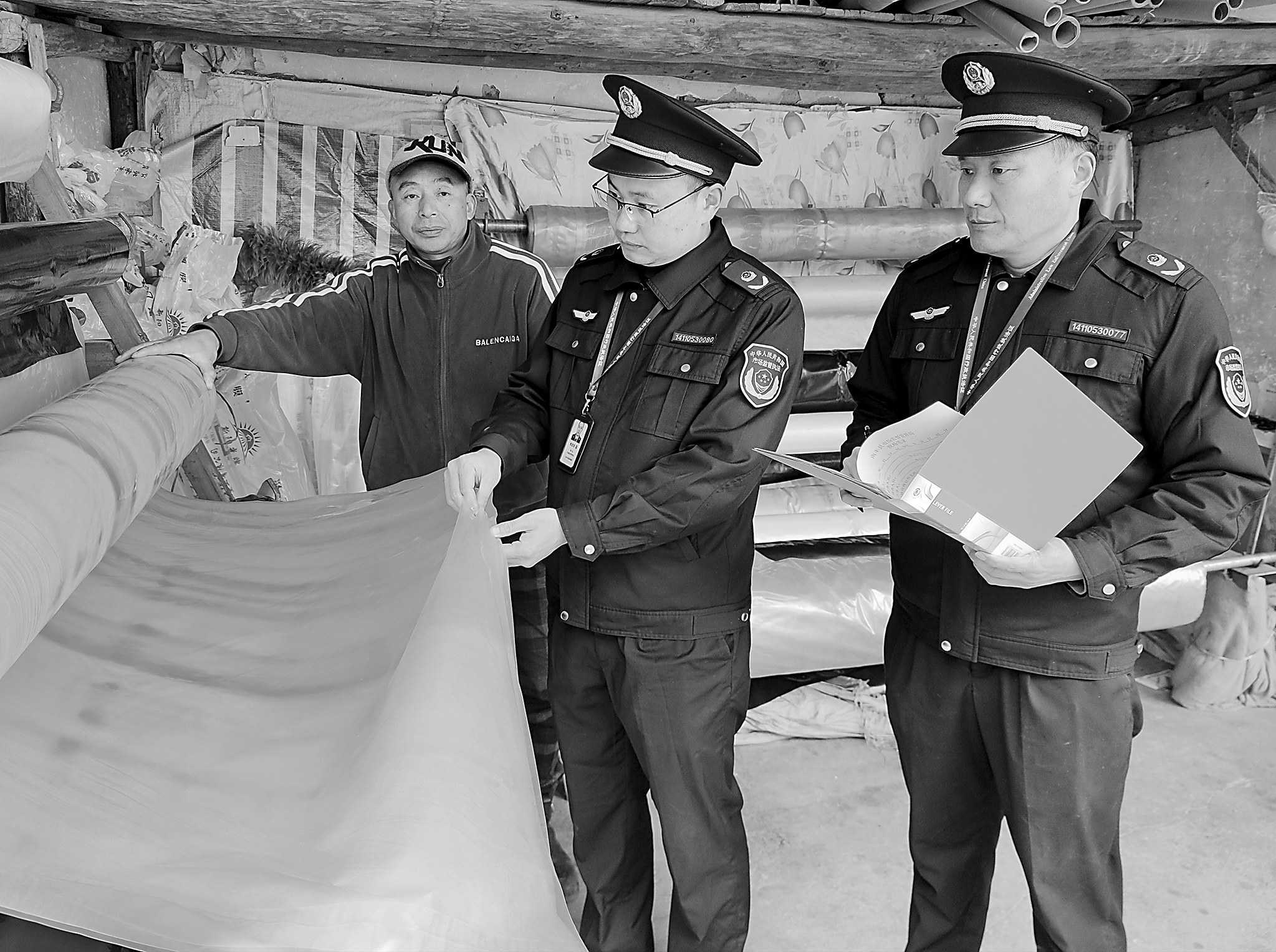 当前正值春耕备耕关键时节,也是农用薄膜使用旺季。为进一步加强农用薄膜产品质量监管,护航春季农业生产,江西省南丰县市场监管局近日组织执法人员深入各农资经营门店,以育秧育苗用的农用薄膜为重点,严查农膜生产厂家、产品规格、执行标准等情况,按照《聚乙烯吹塑农用地面覆盖薄膜》(GB 13735-2017)强制性国家标准规定,严防厚度低于0.01毫米薄膜流入市场。图为3月14日,执法人员在一家农资门店检查农用地膜质量。