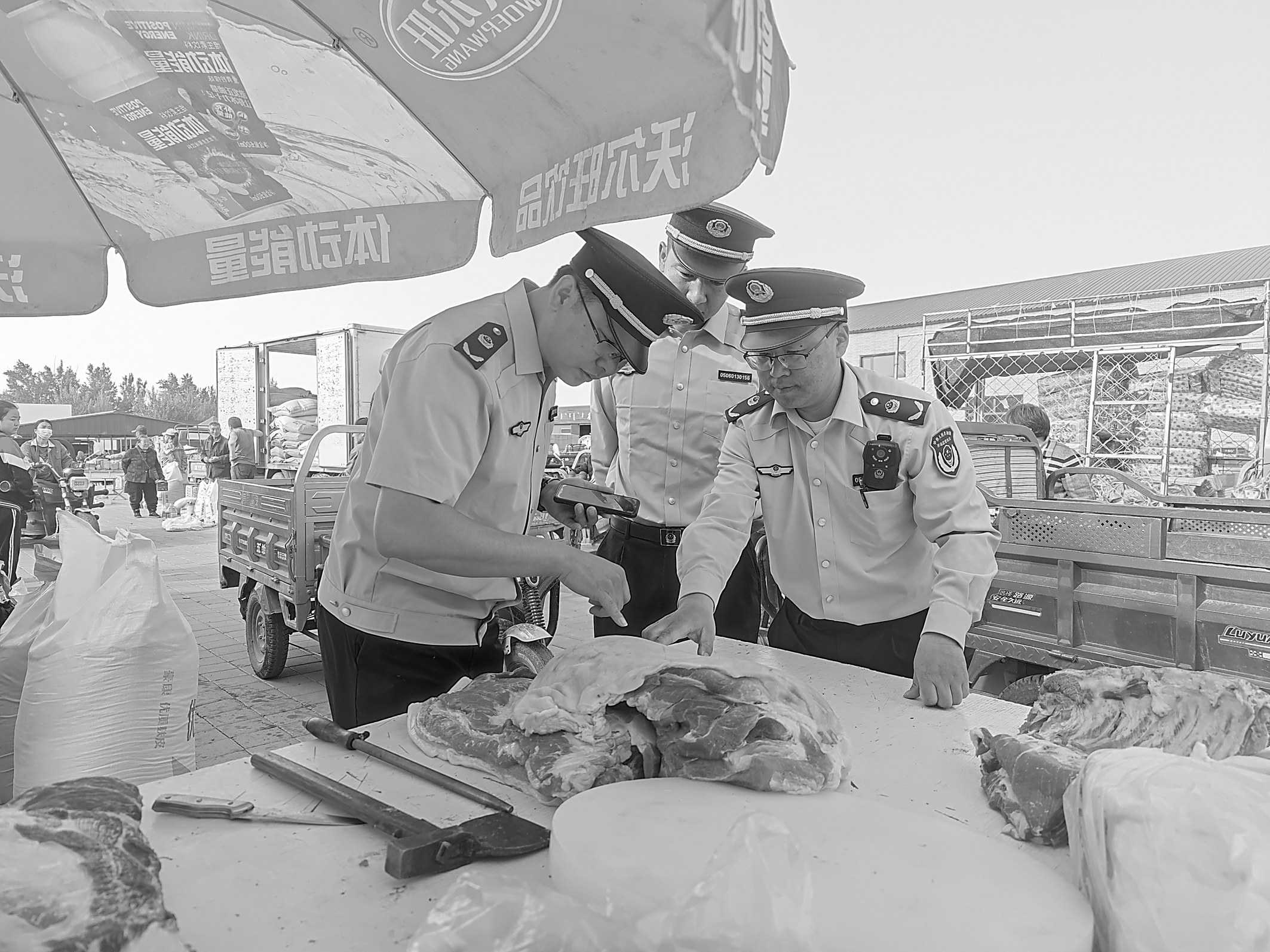 连日来,内蒙古自治区阿鲁科尔沁旗市场监管局全面开展食品安全“雷霆行动”交叉互检工作,组织辖区10个市场监管所跨区域协作,深入排查食品生产经营全链条风险隐患,有效规避属地监管盲区,提高检查结果公信力。图为该局执法人员在一处肉制品经营点检查食品安全情况。 □乌 兰/摄