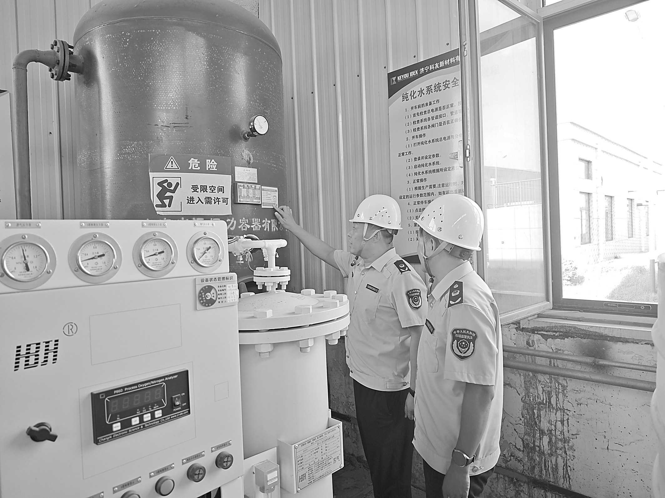 为确保特种设备安全,连日来,山东省金乡县市场监管局开展压力容器专项检查,重点排查高温环境下设备运行稳定性、安全阀及压力表校验情况,严防因热胀冷缩引发的密封失效、承压异常等风险。图为该局执法人员在一家新材料企业检查特种设备安全情况。 □李 舒 渠文林/摄影报道