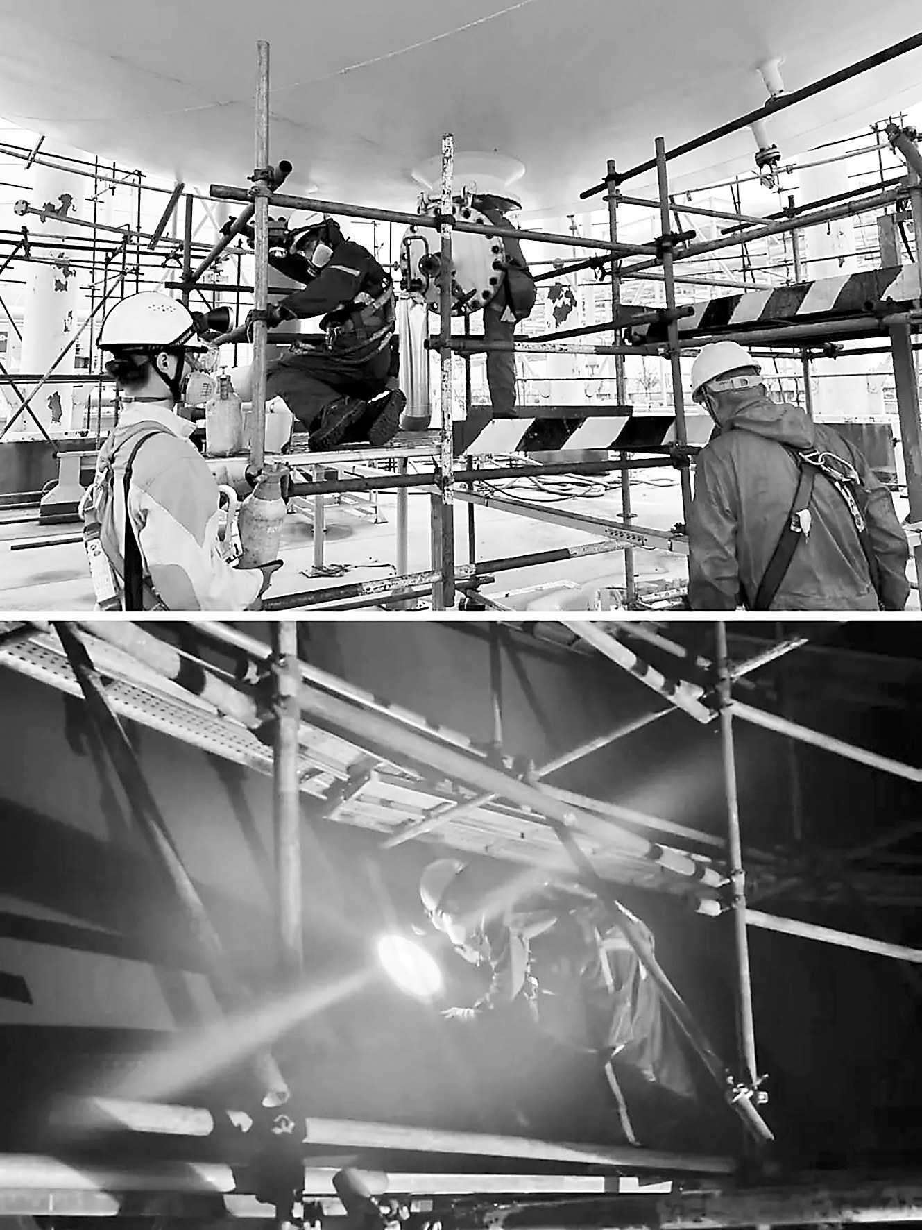 江苏省特检院连云港分院承压二室全体成员克服罐体内近40摄氏度湿热环境,为盛虹炼化4000立方米异丁烷球罐开展检验,严格排查潜在隐患,保障暑期特种设备使用安全。 □赵广州 韩加进/摄影报道