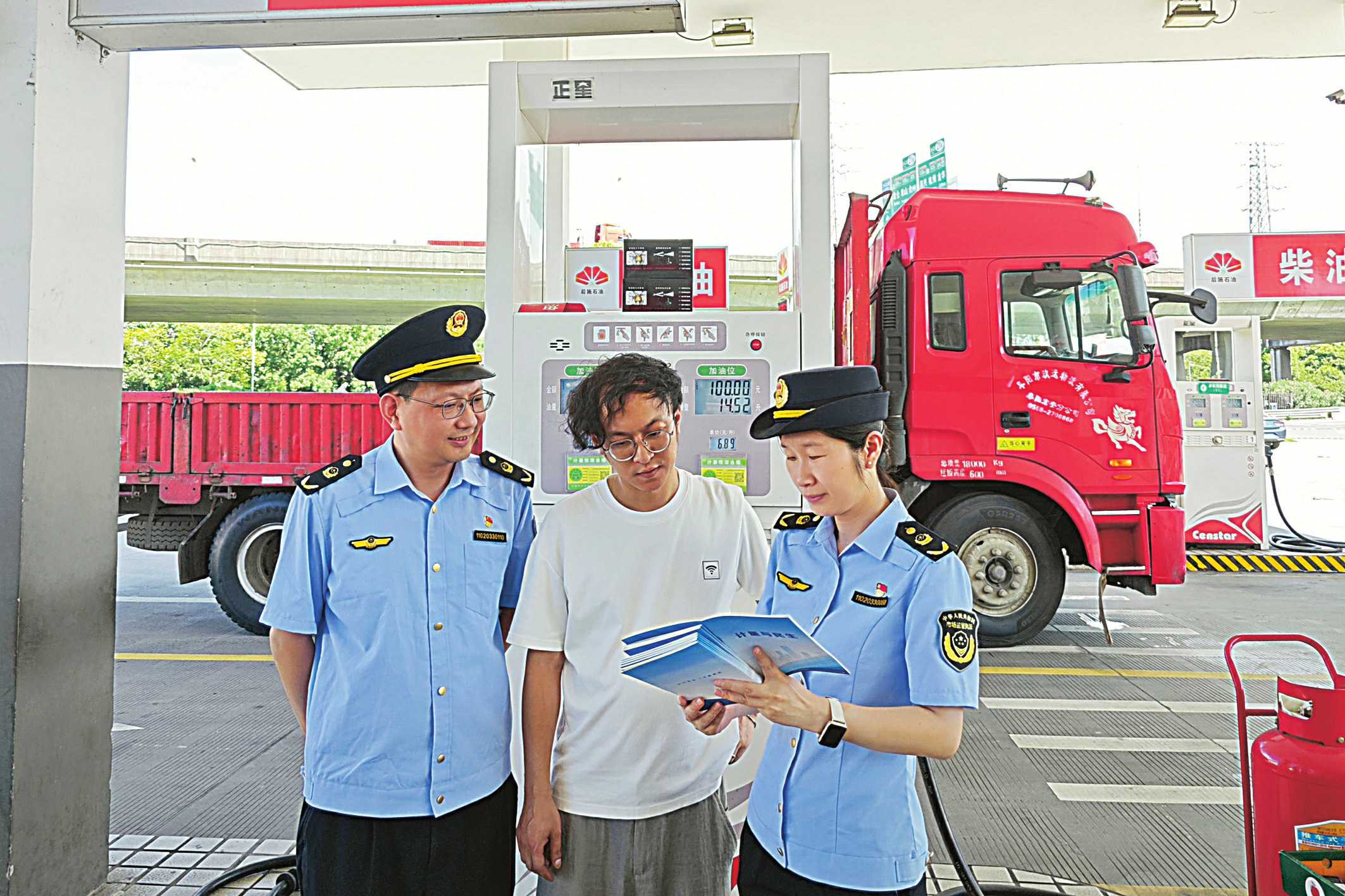 7月24日下午,浙江省宁波市镇海区市场监管局组织执法人员到后施加油站开展执法检查,重点对油品质量进行监督检查与抽检。执法人员仔细查看油品进货渠道、质检报告等材料,并向加油站工作人员和过往消费者宣传计量法律法规、油量计量知识,引导加油站规范计量操作,落实好加油枪强制检定要求,提醒消费者在加油过程中留意计量数值。 □冯昱靖/摄