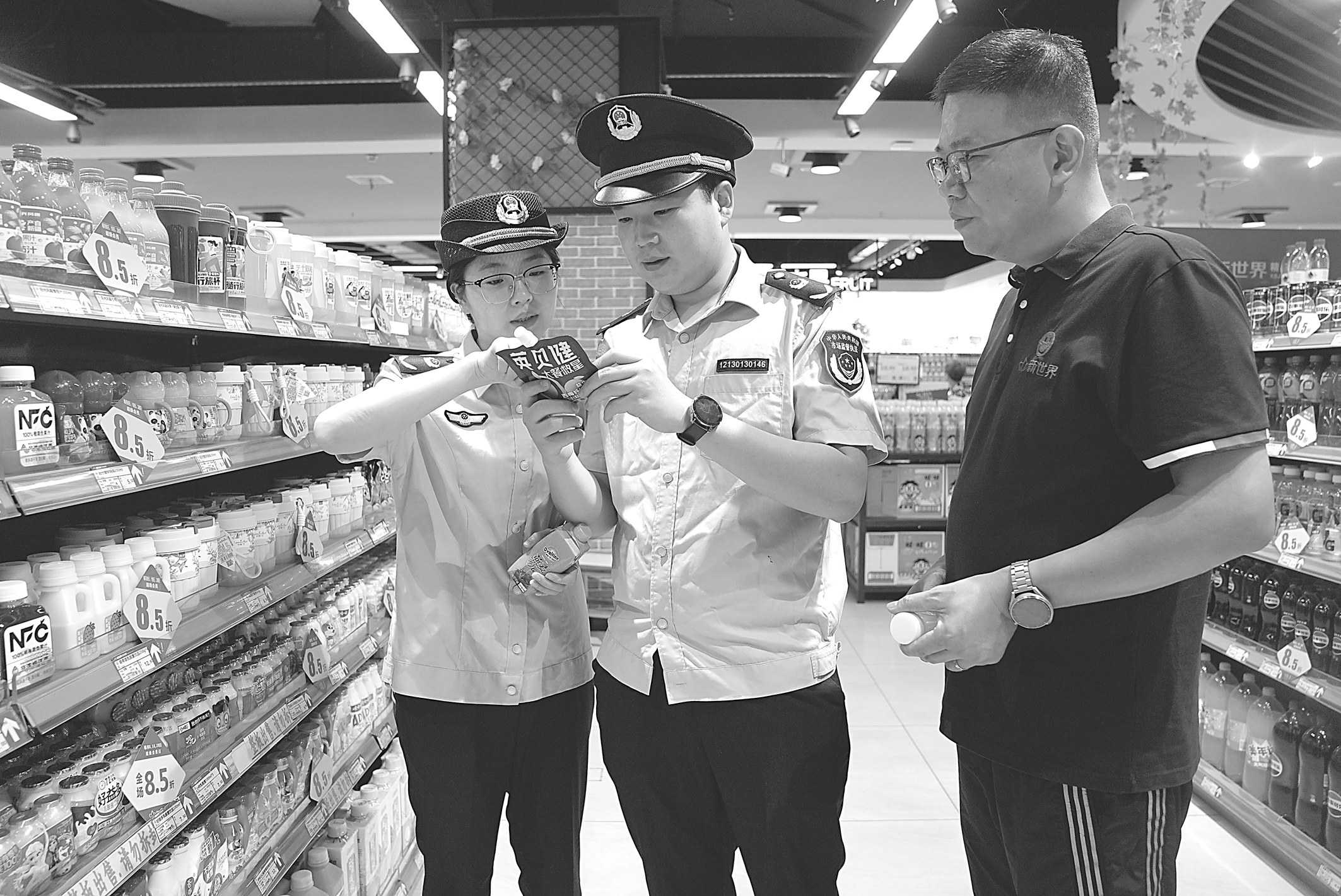 连日来,安徽省枞阳县市场监管局执法人员深入超市、商店等开展饮品市场专项检查,重点检查经营单位进货查验、索证索票、食品存储条件等情况。图为8月18日,执法人员在一家超市查看饮品标签。 □吴 帆/摄
