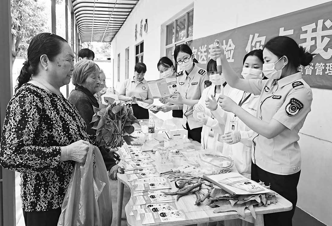 夏季天气炎热,是食品安全问题易发高发期。为进一步强化食品安全监管,江西省于都县市场监管局连日来开展夏季食品“你点我检 你送我检”进商超、社区活动。左图为8月18日,该局食品安全检测人员在一社区免费为居民检测食品。 □王雨林/摄