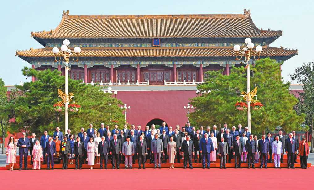 大会开始前,习近平和夫人彭丽媛在端门外广场迎接出席大会的外方代表团团长及其配偶,并同他们合影留念。