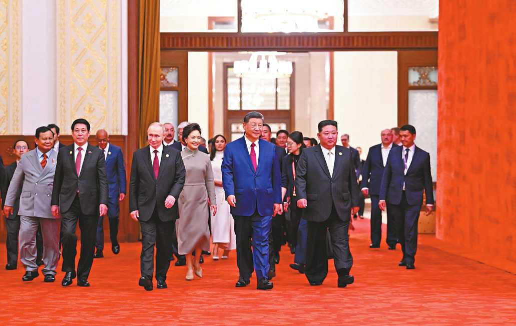 9月3日,纪念中国人民抗日战争暨世界反法西斯战争胜利80周年招待会在北京人民大会堂隆重举行。中共中央总书记、国家主席、中央军委主席习近平出席招待会并发表重要讲话。这是习近平和夫人彭丽媛同出席招待会的外国领导人夫妇共同步入宴会厅。 □新华社记者 谢环驰/摄