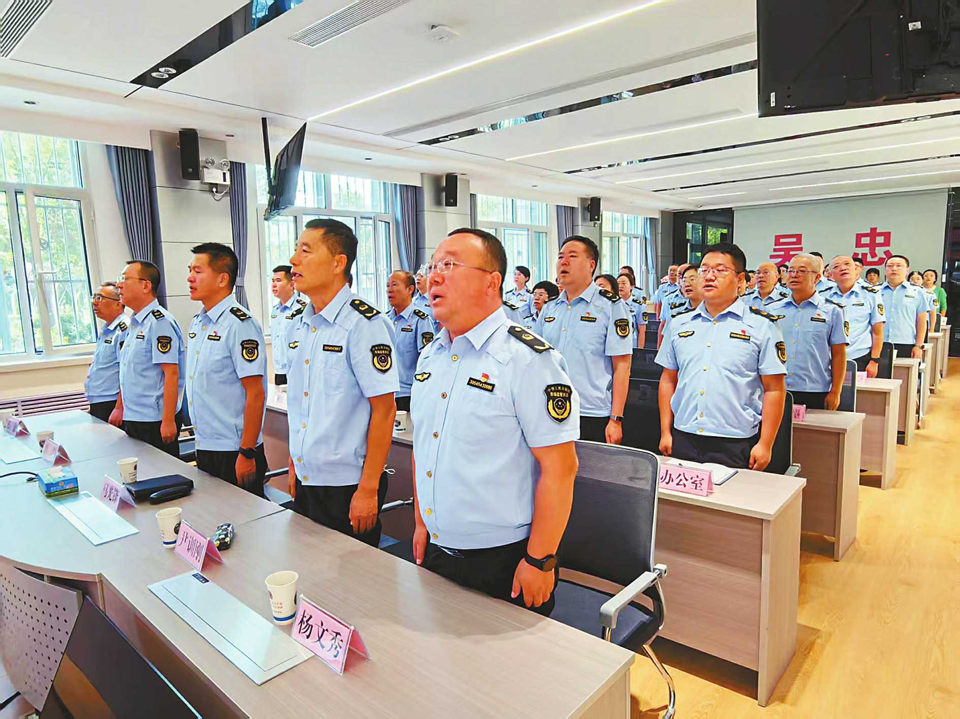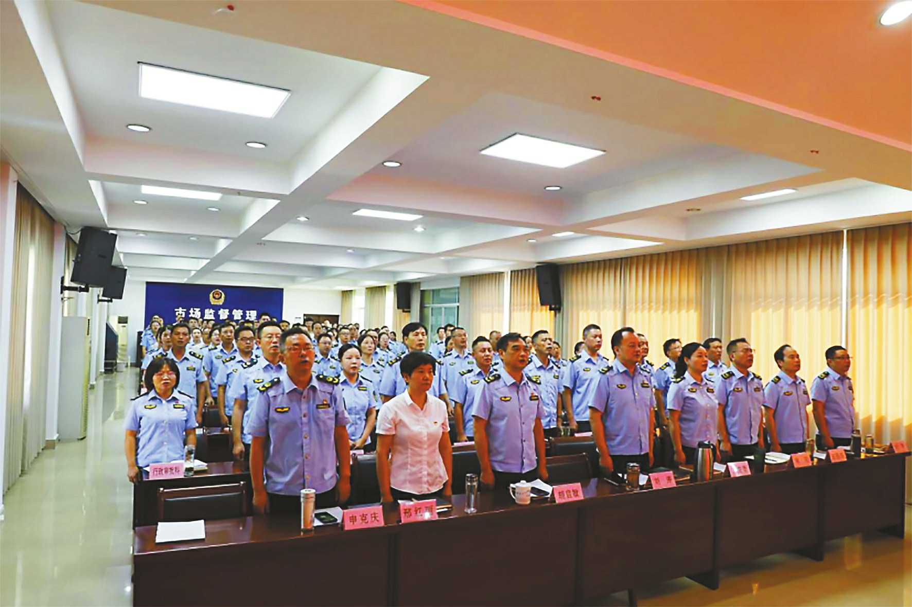 9月3日,宁夏回族自治区吴忠市市场监管局组织干部职工集中收看纪念中国人民抗日战争暨世界反法西斯战争胜利80周年大会。当国歌声响起时,党员干部全体起立,齐唱国歌。 □李 勇/摄