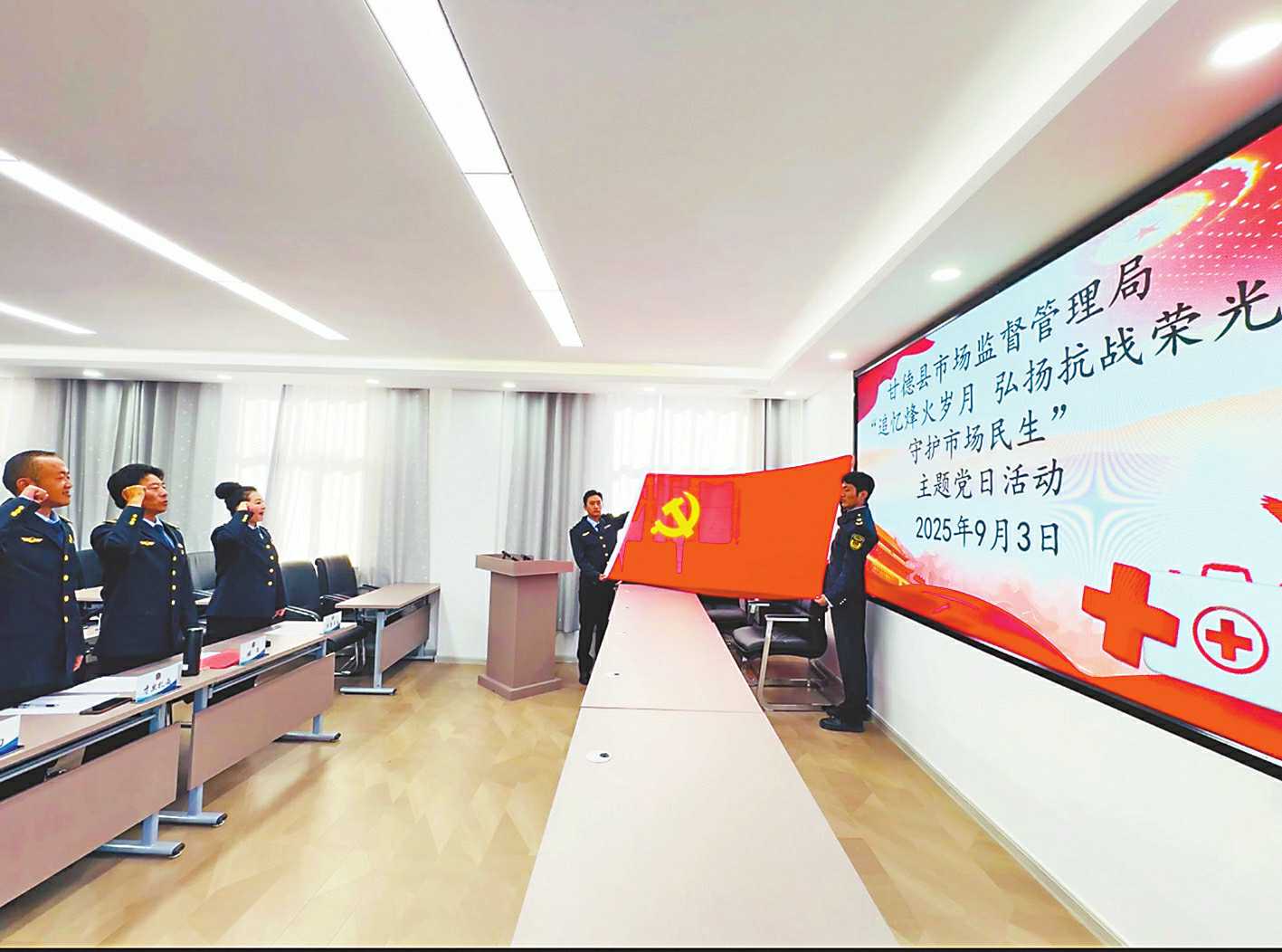 9月3日,在收看纪念中国人民抗日战争暨世界反法西斯战争胜利80周年大会盛况后,青海省甘德县市场监管局组织全体党员干部职工开展了一场意义非凡的“追忆烽火岁月、弘扬抗战荣光、守护市场民生”主题党日活动。图为该局全体党员在重温入党誓词。 □华吉卓玛/摄