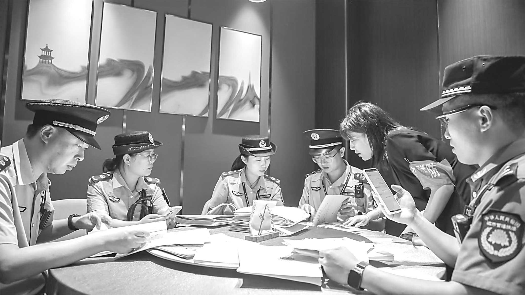 图为北京市海淀区市场监管局联合有关部门对一家企业进行“综合查一次”检查。