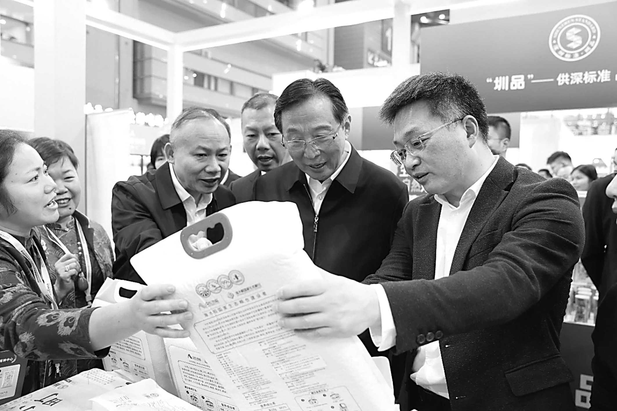 图为深圳市市场监管局党组书记、局长蔡英权(右一)与中国乡村发展协会会长韩长赋(右二)一同参观2024全球高端食品及优质农产品(深圳)博览会上的“圳品”专区。