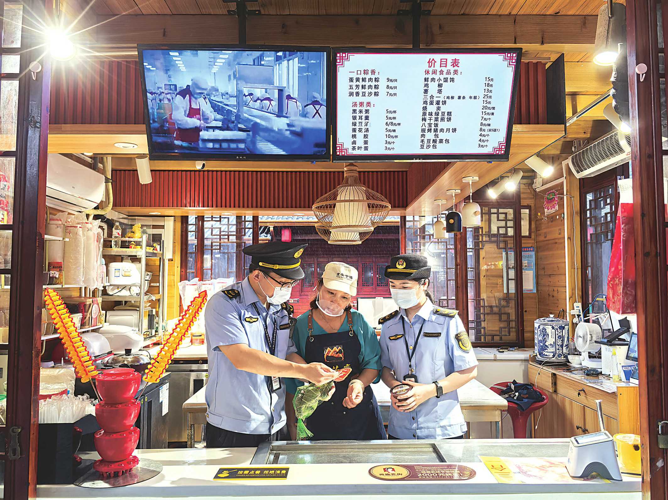 连日来,浙江省宁海县市场监管局围绕食品安全、价格计量、特种设备、消费投诉等关键领域,对旅游景区及周边经营户开展专项检查,保障节日旅游市场秩序稳定。图为9月28日,该局工作人员对景区商家开展散装食品外包装信息标注方面的指导。 □胡 洁/摄