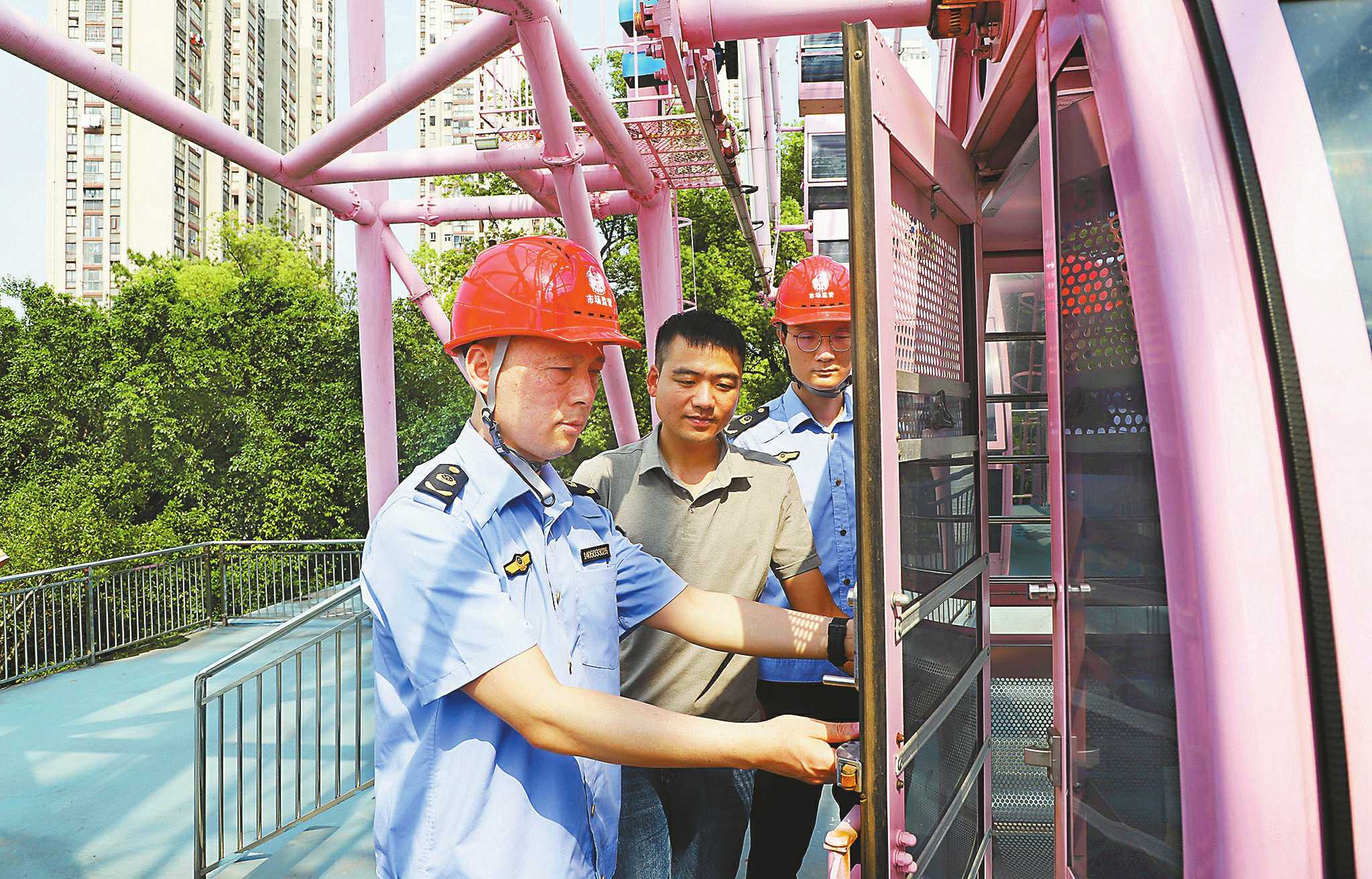 国庆、中秋长假期间,江西省新余市渝水区市场监管局以公园、游乐场、旅游景点等公众聚集场所为重点,严格检查设备运行记录、安全保护措施及操作人员持证等情况,确保特种设备使用安全。图为10月8日,该局执法人员对一游乐场摩天轮进行检查。 □廖海金/摄