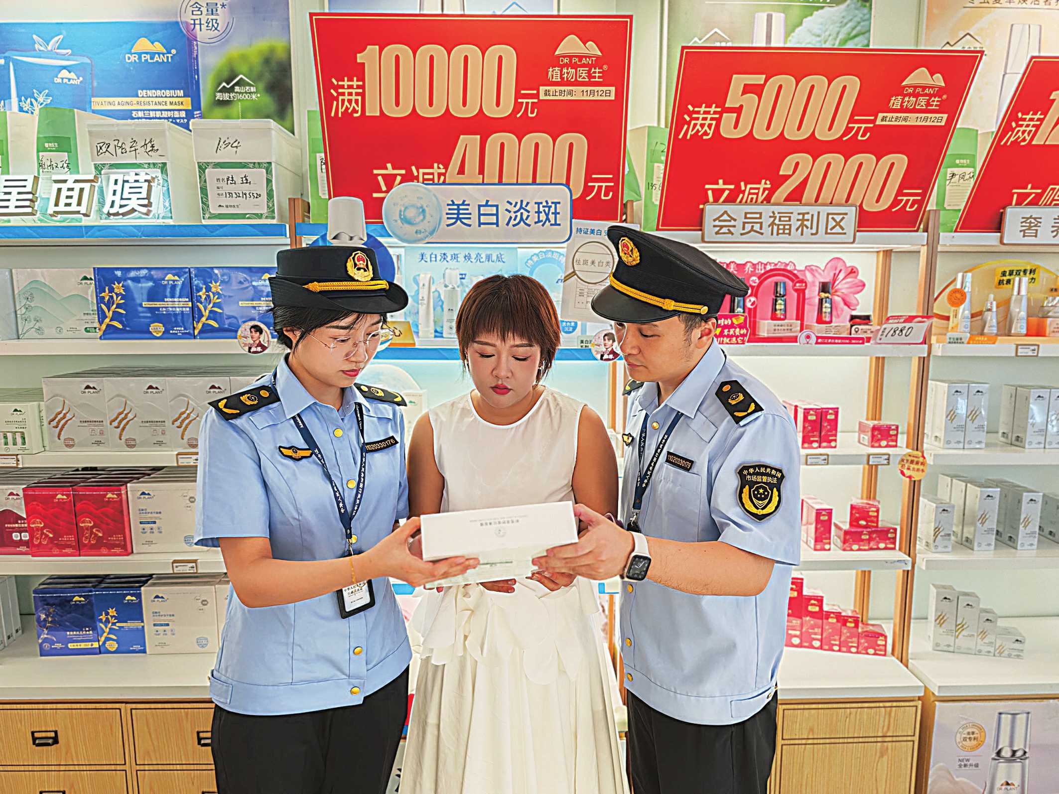 浙江省宁波市镇海区市场监管局近期开展化妆品检查行动。执法人员逐一核查店铺经营资质,严查过期、“三无”及虚假宣传商品,同时畅通投诉渠道,快速处理纠纷。图为执法人员在一家化妆品经营门店查看面膜产品包装信息。 □李 煜/摄