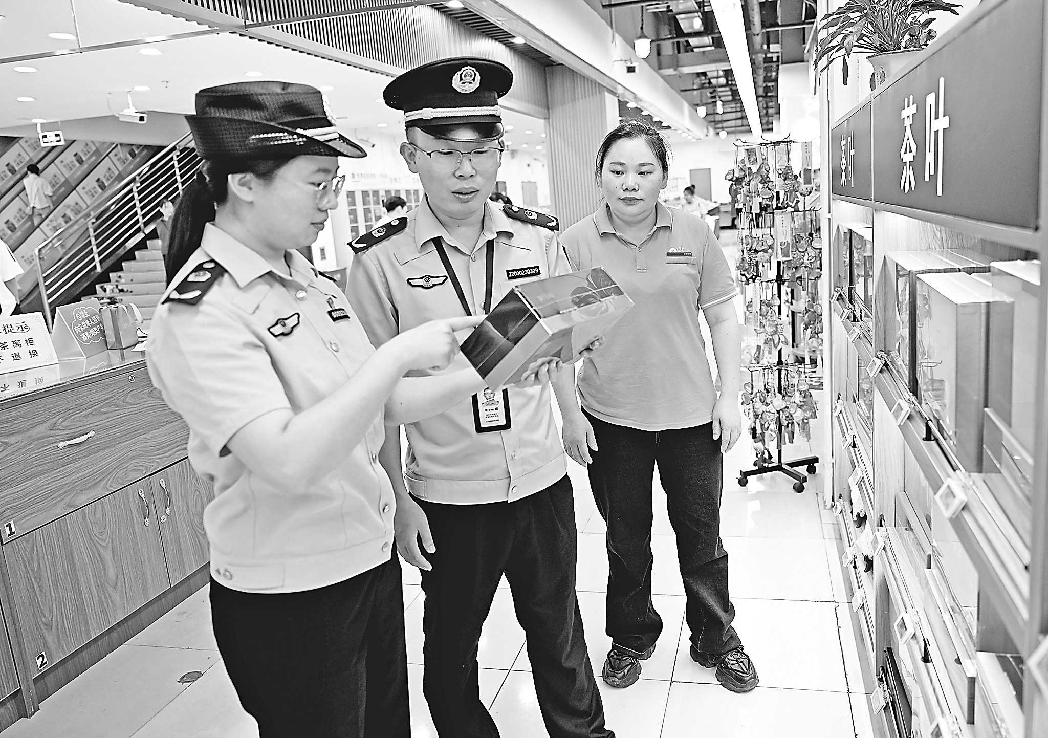 为遏制茶叶过度包装行为,近日,重庆市涪陵区市场监管局集中开展茶叶过度包装专项执法行动,围绕包装层数、空隙率、成本占比等指标,对经营户在售多款茶叶开展检查,并宣传限制商品过度包装的相关规定,督促企业落实主体责任,优化包装设计,让茶叶“轻装上阵”。图为10月13日,该局执法人员在一家超市检查是否存在茶叶过度包装行为。 □郭星雨 文光辉/摄影报道