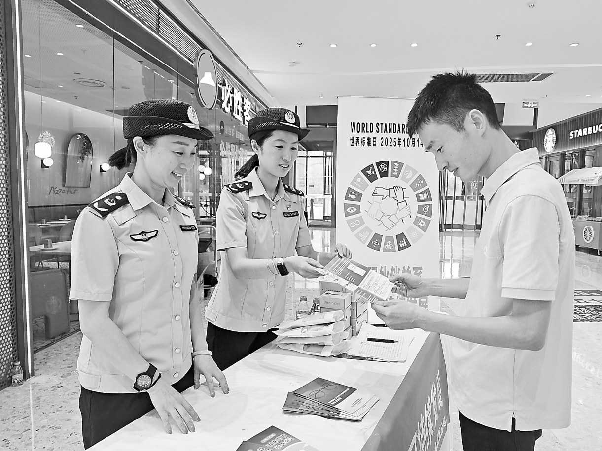 10月14日,浙江省宁波市市场监管局高新区分局举办2025年世界标准日宣传活动。图为该局工作人员向市民发放宣传手册,普及标准化知识。 □姜珂身 董 娟/摄影报道