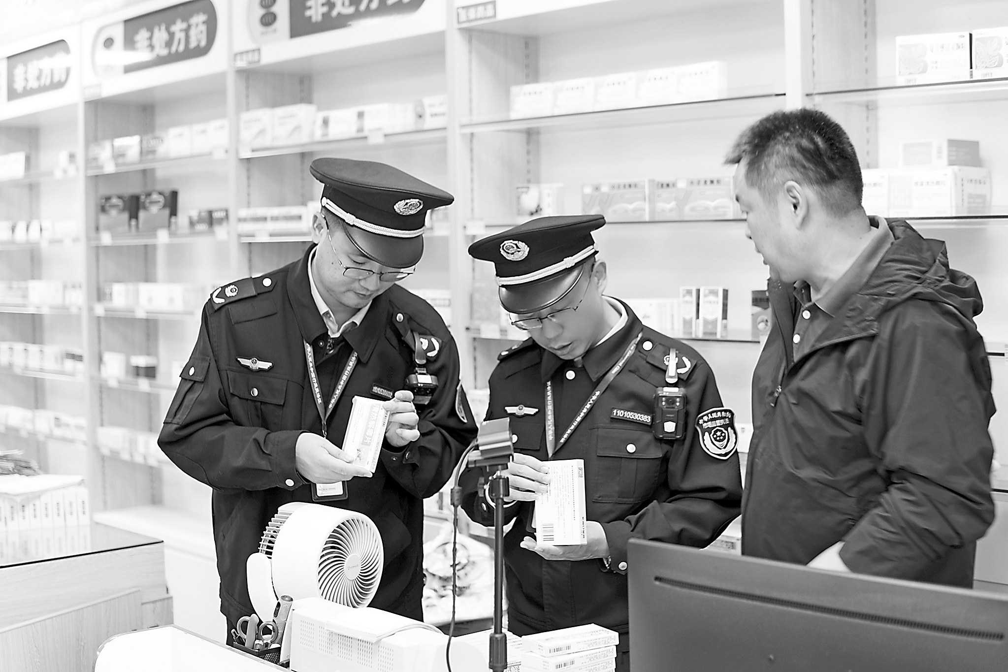 10月21日,浙江省杭州市萧山区市场监管局开展小药店、小诊所、小美容机构“三小”治理暨集中整治“突击战”集群战役专项执法检查。图为该局执法人员在一家药店排查相关情况。 □种振新/摄