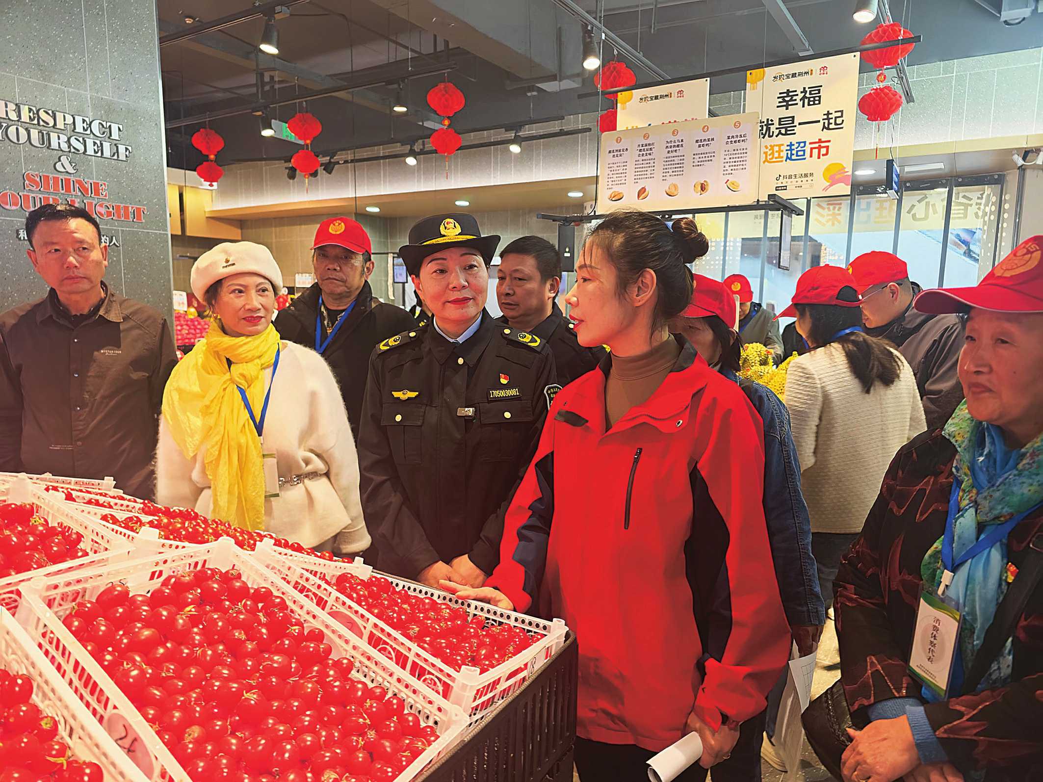 10月23日,湖北省荆州市市场监管局、荆州市消费者委员会邀请“两代表一委员”、媒体记者、消费者代表在好邻居超市、永辉超市开展“商超透明购”新型超市消费体察活动,让消费者买得放心、吃得安心、用得舒心。图为体察团代表听好邻居超市负责人介绍放心消费建设情况。 □李明湘 万 鹏/摄影报道
