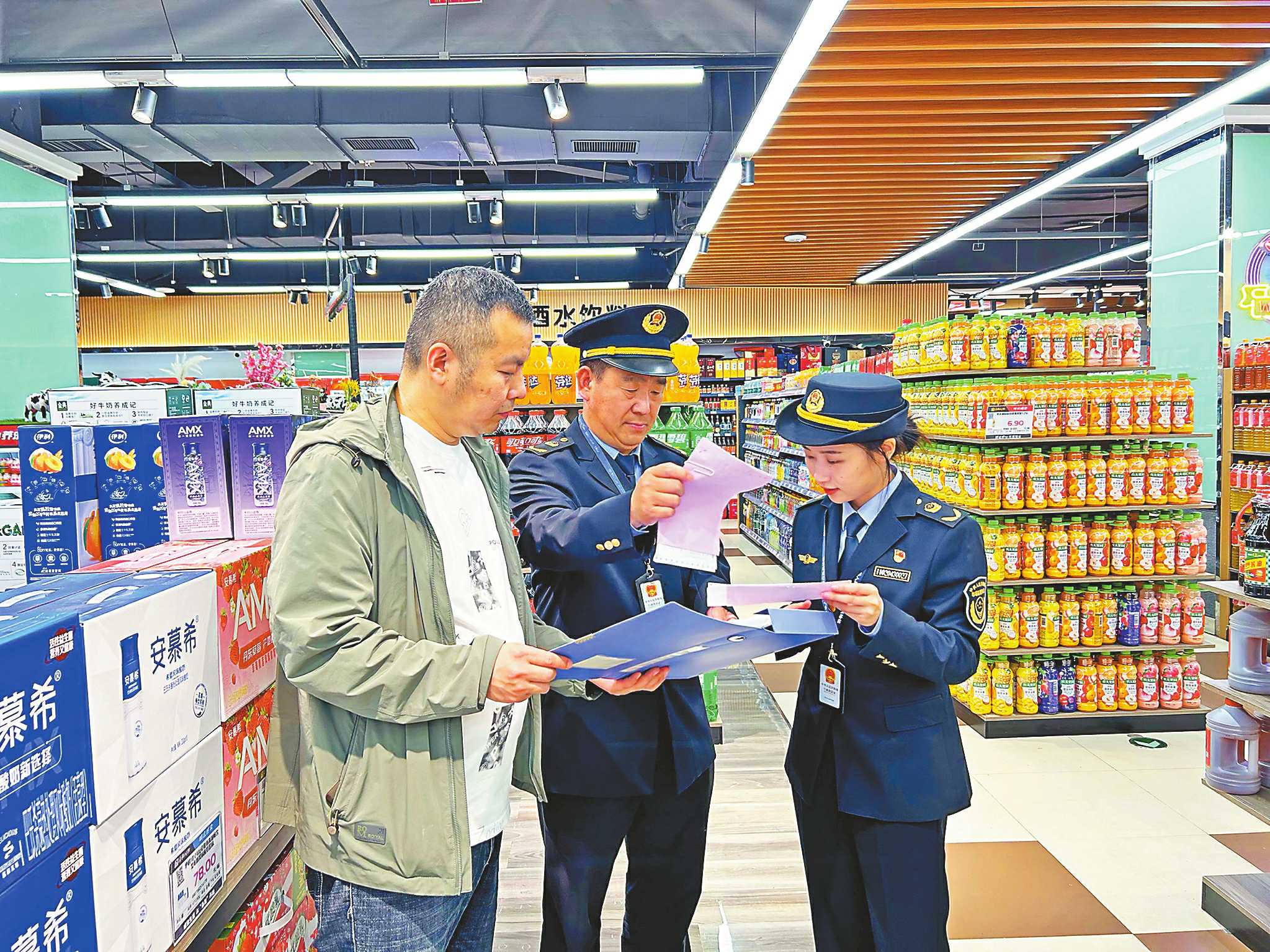 近日,浙江省宁波市北仑区市场监管局执法人员对辖区中大型超市开展日常检查,核对超市所销售食品的进货台账,查看供应商资质、产品检验报告及进货日期,确保食品来源可追溯、资质齐全。图为检查现场。 □倪佳依/摄