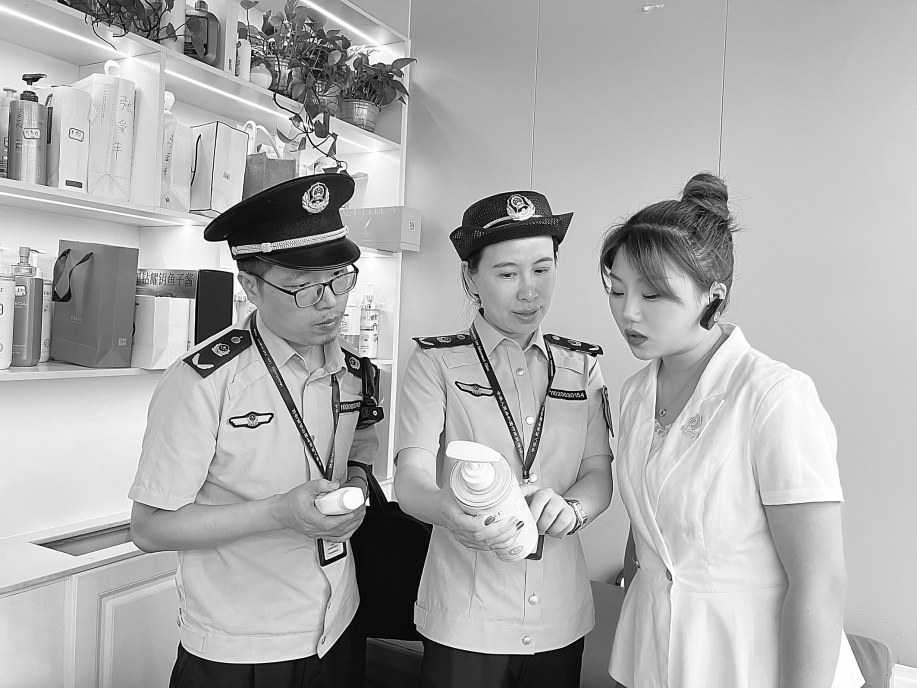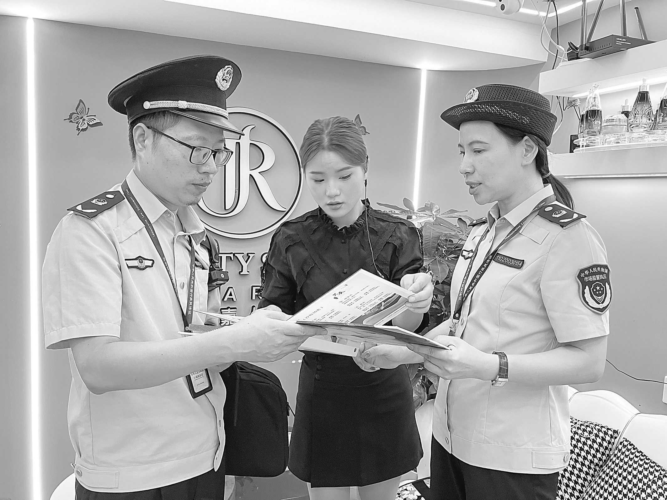 为进一步规范预付式消费市场秩序,保护消费者合法权益,近日,浙江省宁波市市场监管局高新区分局开展美容美发等重点领域预付式消费突出问题违法行为专项整治行动。图为执法人员现场检查指导化妆品合规使用情况。