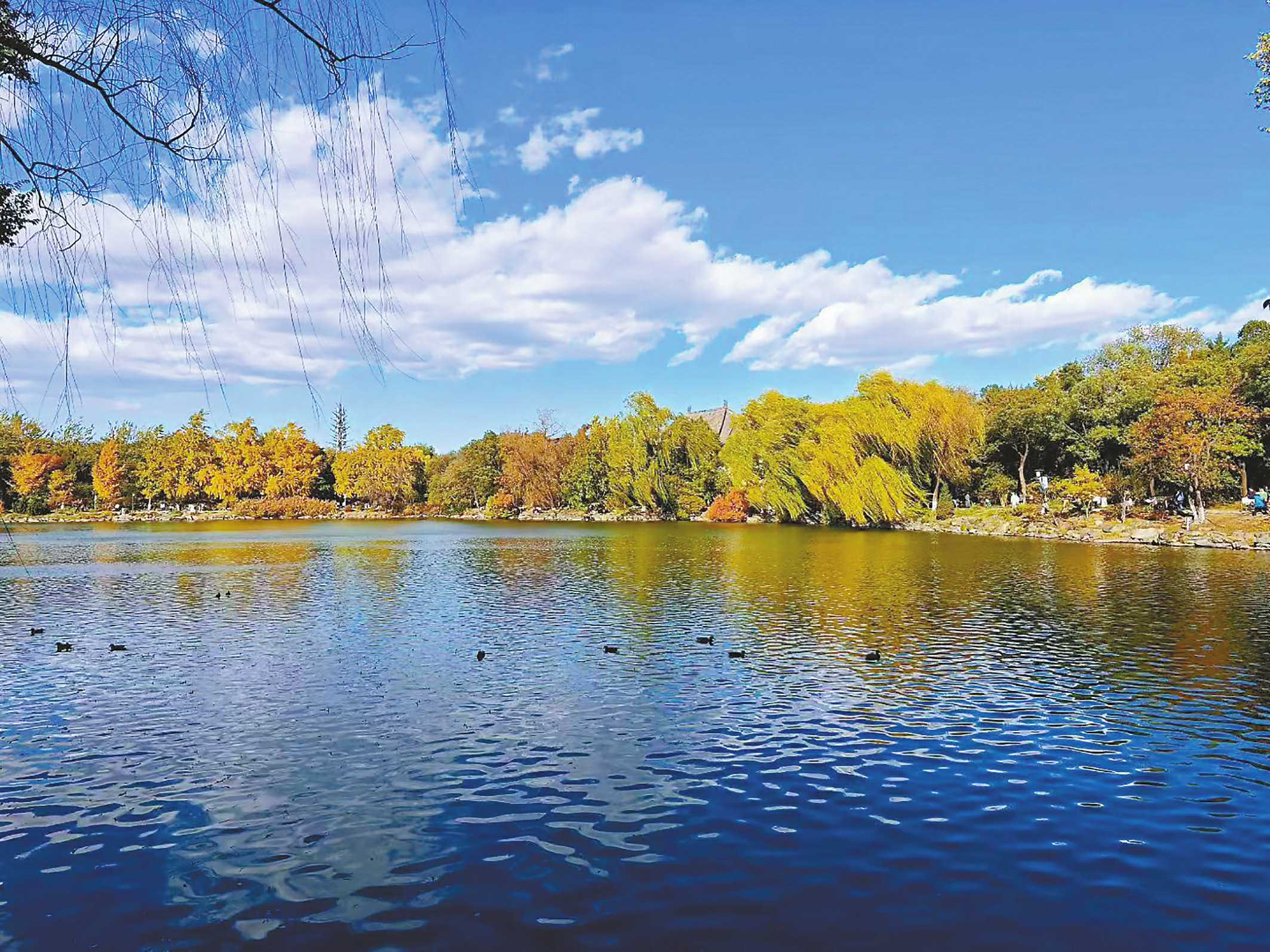 湖畔林木是秋日的调色盘,金黄、橙红、翠绿交织,笔者特意将不同色彩的树木分布在画面中景,让层次自然铺展。柳枝从左上角垂落,既增添了灵动性,又巧妙平衡了画面重心。水面的波纹和游弋的水鸟是点睛之笔,它们让静态的画面有了生机,笔者耐心等待水鸟排成有趣的队列,捕捉到水纹与鸟影共舞的瞬间。
