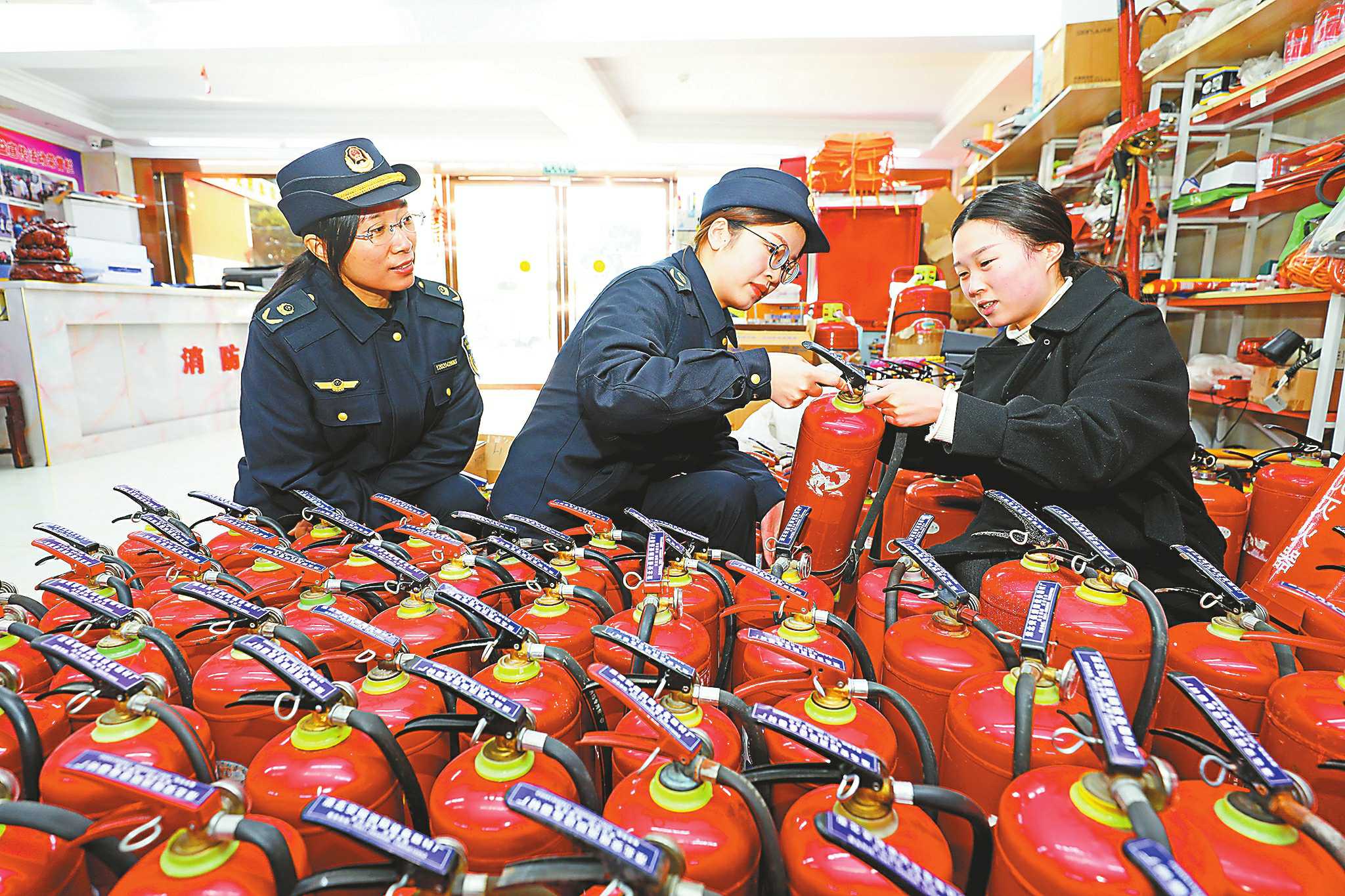 安徽省淮北市市场监管部门强化消防产品质量监管,连日来组织执法人员开展灭火器等消防器材产品质量安全专项行动,重点检查消防产品CCC证书有效性及执行标准、标识标签、生产日期、表显压力合规情况,督促经营单位严格落实产品质量进货查验制度。图为11月9日,执法人员对市场销售的消防器材产品进行检查。 □李 鑫 崔 勇/摄影报道
