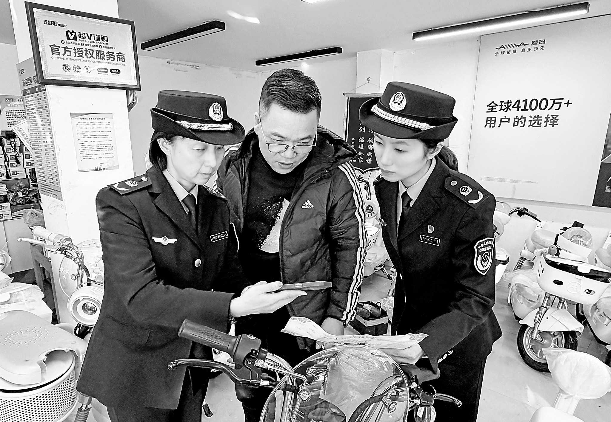 11月26日,浙江省宁波市市场监管局高新区分局对电动自行车销售门店集中开展专项检查,重点加强电动自行车及相关产品质量监督。图为该局工作人员检查在售电动自行车合格证。 □姜珂身 董 娟/摄影报道