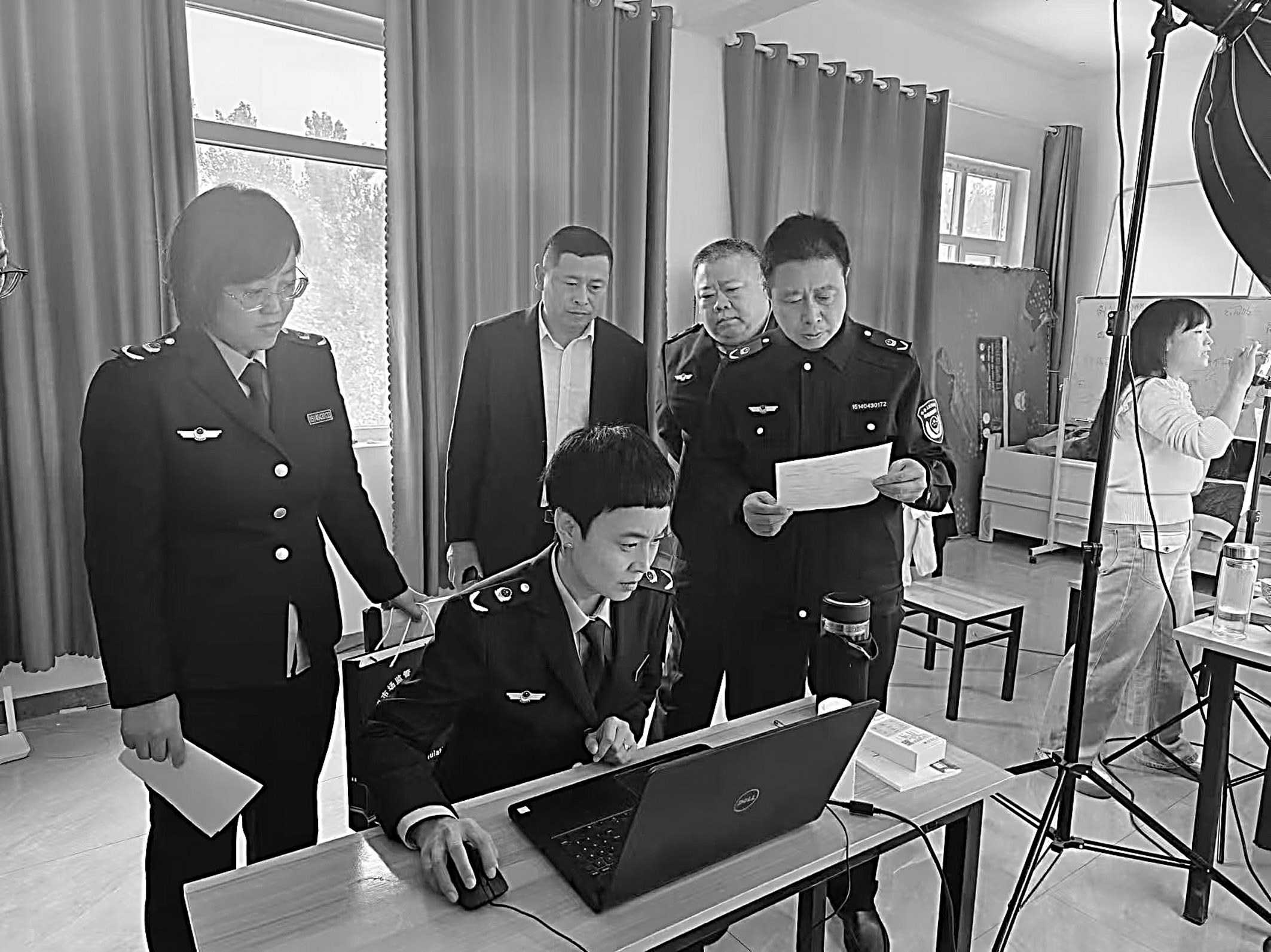 “双十二”购物旺季来临之际,山东省聊城市莘县市场监管局近日对辖区直播电商经营主体的营销活动开展专项监督检查。图为执法人员在直播电商产业园内进行检查。 □周宪峰/摄