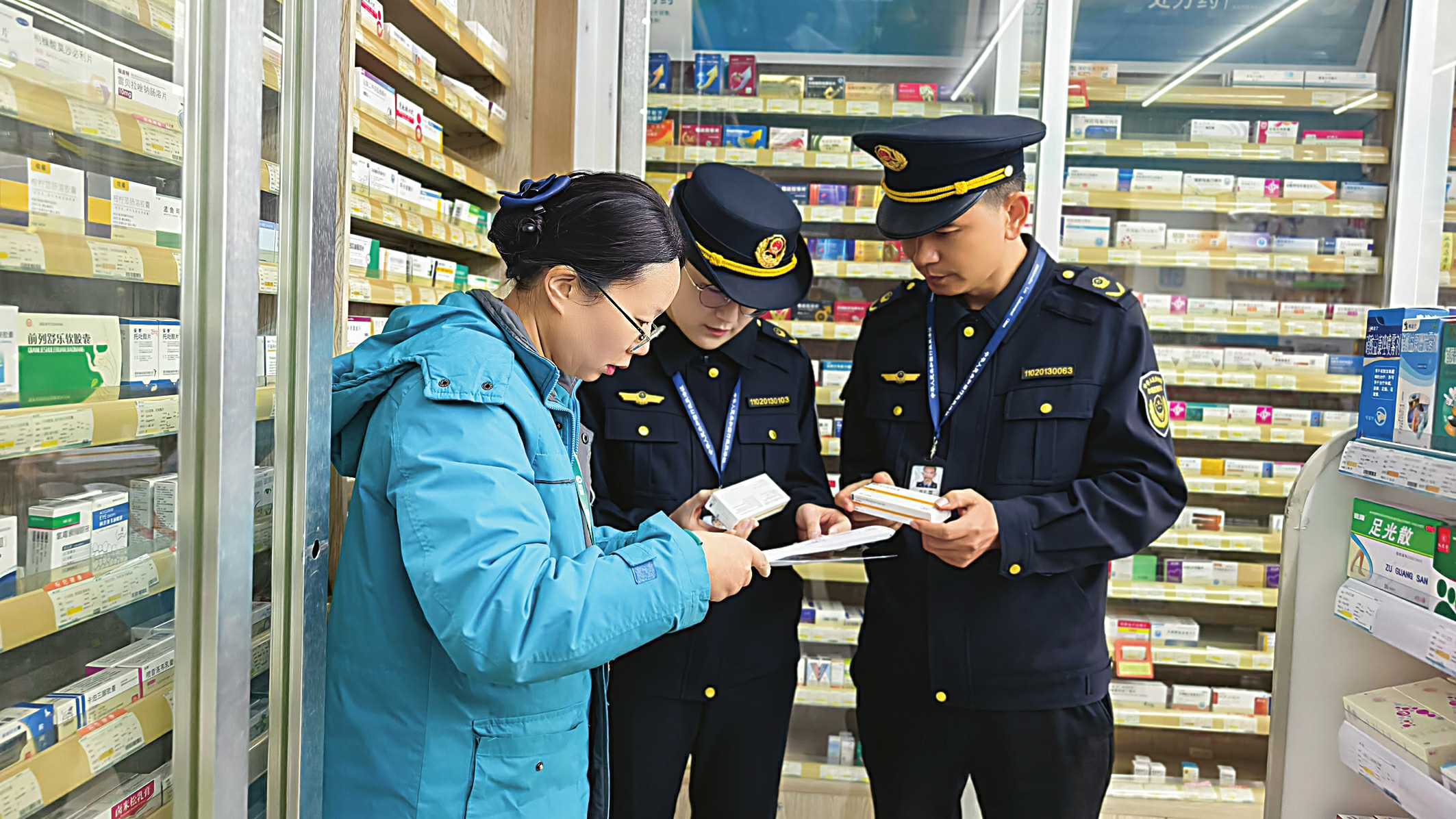 为规范冬季药品市场经营秩序,切实保障群众冬季用药安全,浙江省宁波市海曙区市场监管局以药店、诊所为主要检查对象,开展冬季药品专项检查。图为12月8日,执法人员检查药店是否按规定凭处方销售流感处方药品。 □洪双华/摄