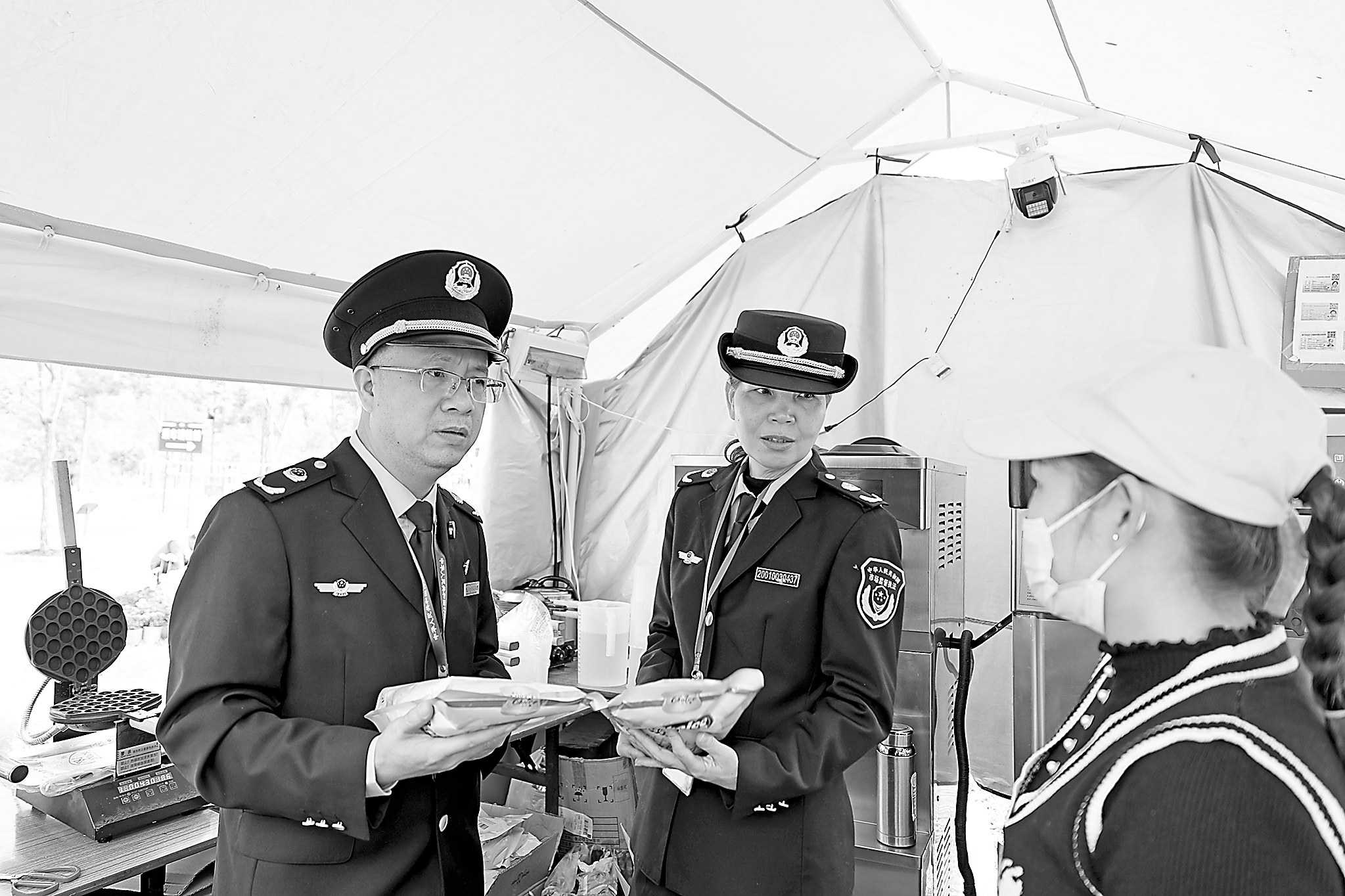 第十届青秀山菊花展正在广西壮族自治区南宁市举办。各色菊花竞相绽放,吸引大批市民、游客前来观赏。南宁市市场监管局青秀山风景区分局持续加大食品安全监管力度,为市民、游客观赏游玩营造安全的食品环境。图为12月9日,该分局执法人员对菊花展主会场的餐饮摊点开展食品安全检查,同时向经营户宣讲食品安全法律法规知识。 □何正君/摄