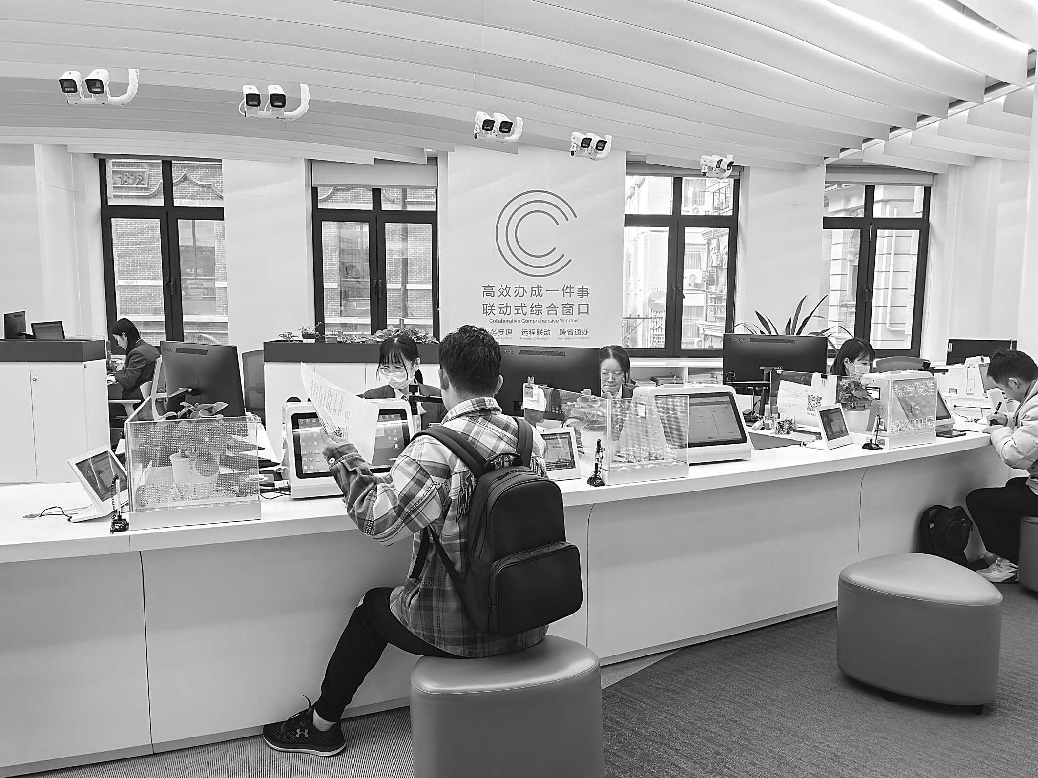 上图:上海市黄浦区政务服务中心办事大厅“高效办成一件事”联动式综合窗口为办事人提供跨省通办、远程联动等企业登记注册、变更服务。