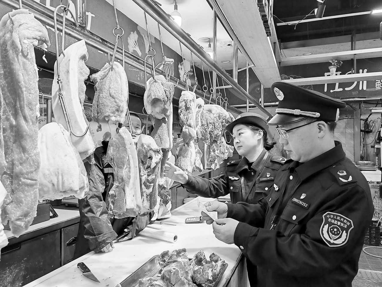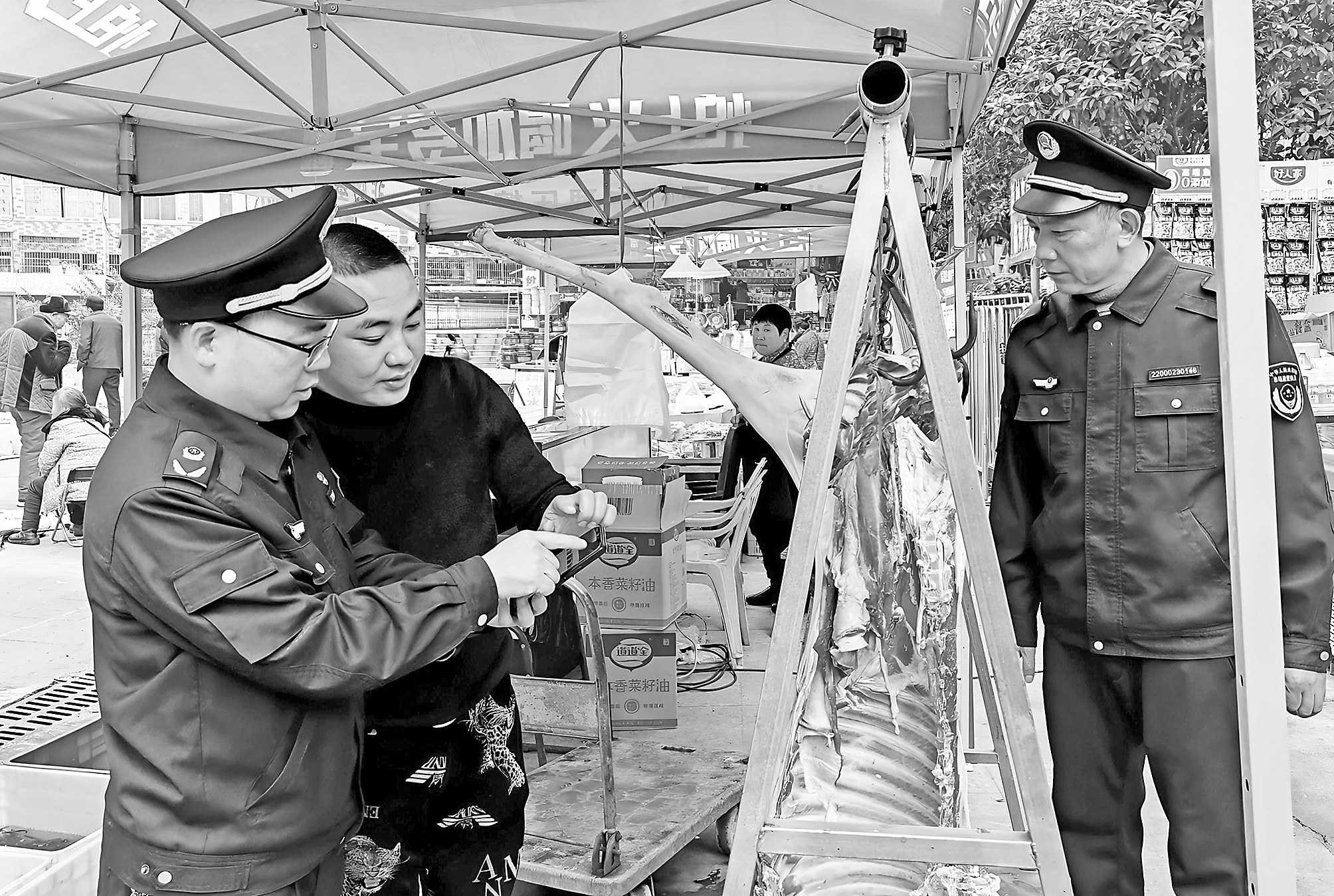 近日,重庆市涪陵区市场监管局组织开展肉制品质量安全专项检查。执法人员现场查验猪肉“两证两章一报告”、进货台账、贮存条件、标签标识等情况,督促经营者落实索证索票制度,严禁采购、销售来源不明、未经检验检疫的肉制品。图为12月12日,执法人员在农贸市场进行检查。