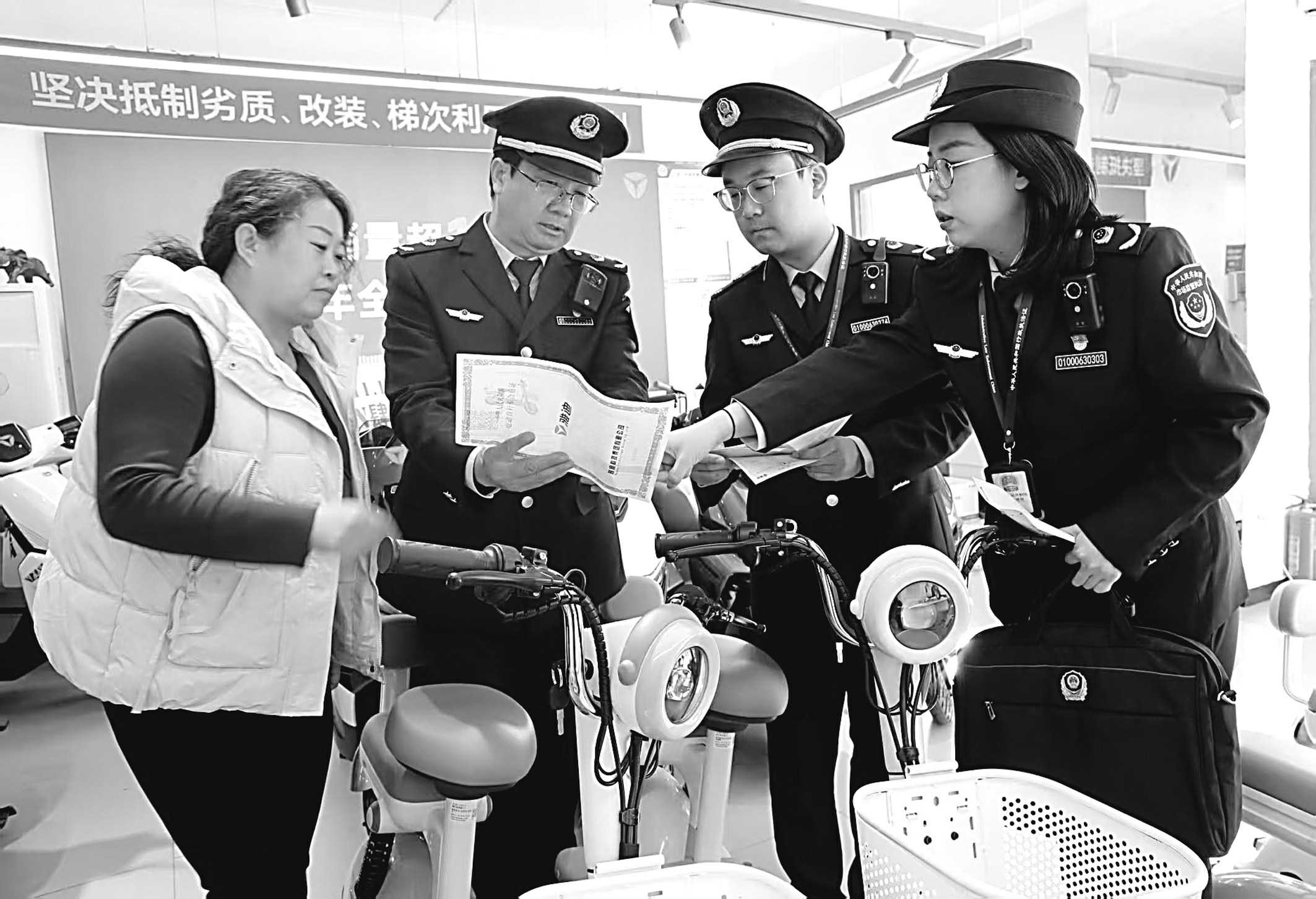 为贯彻落实电动自行车安全隐患全链条整治行动部署,北京市石景山区市场监管局近期开展联合检查,进一步规范辖区电动自行车经营主体销售行为。图为该局执法人员对销售主体开展专项督导检查并对新国标进行宣传。 □张学功/摄