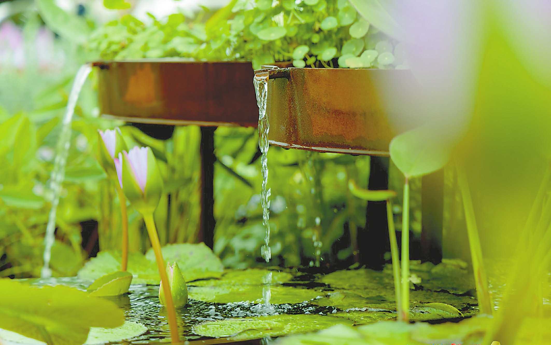 笔者在忙碌的工作间隙,有幸邂逅了一处别致的景致,并用镜头记录下了那一瞬间的美好。初到拍摄地点,映入眼帘的是一片生机盎然的景象。画面中心,古朴的陶制花盆悬于半空,潺潺流水从边缘倾泻而下,宛如一条条晶莹的丝线,在阳光的映照下闪烁着细碎的光芒。水流落入下方的水生植物池中,泛起层层涟漪,仿佛是大自然演奏的灵动音符。