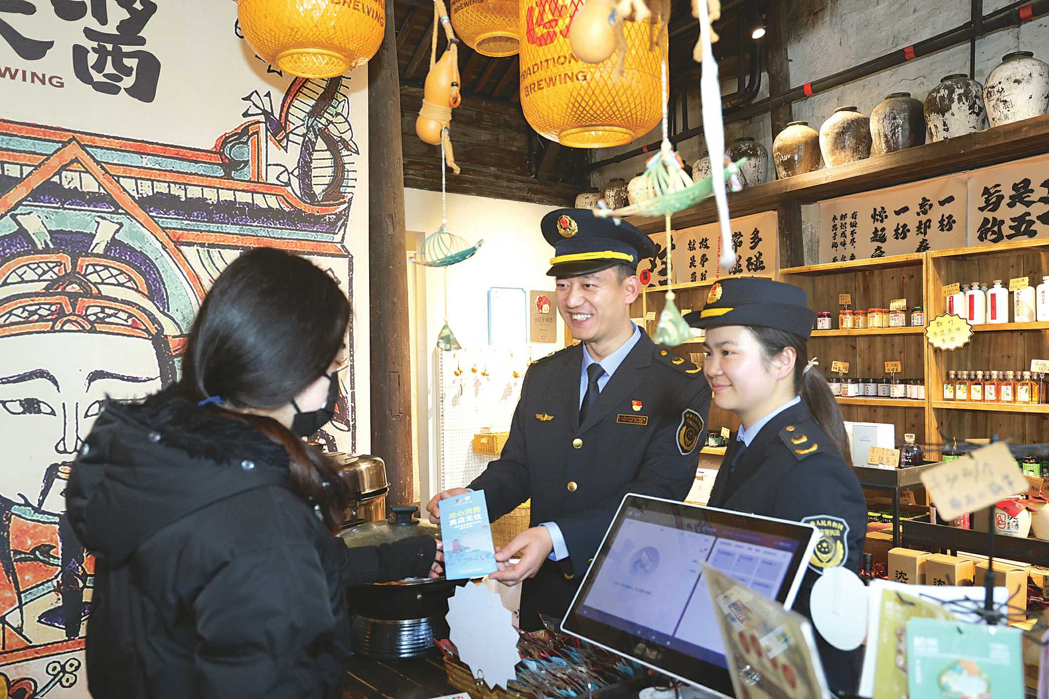 十二月十九日,浙江省杭州市市场监管局对辖区小河直街上的商户开展指导检查。该局执法人员向商户讲解“一键和解”操作步骤、宣贯相关政策,引导其积极运用数字化平台。图为执法人员在一家店铺发放“一键和解”操作手册并指导商户使用。 □朱诗瑶/摄