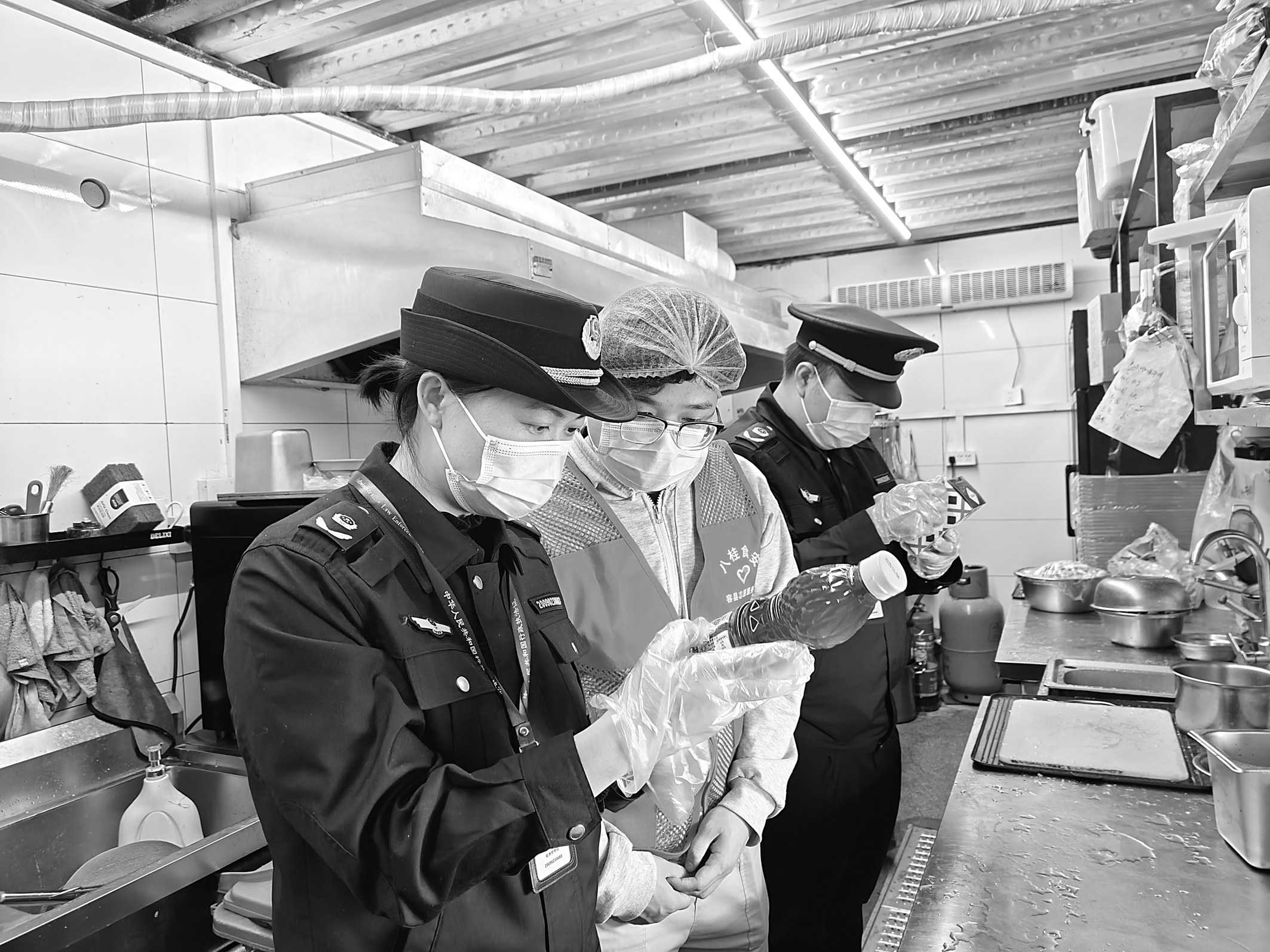 近日,广西壮族自治区容县市场监管局联合八桂食安志愿者,对辖区热门网红餐厅和无堂食外卖商家开展突击检查。重点检查商家食品经营资质、员工健康证明、食材采购和存放、加工操作以及餐具清洗消毒情况,并检查外卖包装标识合规性。此次共检查14户商家,发现食材贮存不规范、加工区域环境卫生有待提升等问题5个,已当场提出整改要求,后续将跟踪复查。 □本报记者 孔国俊 通讯员 赵师漾/摄影报道