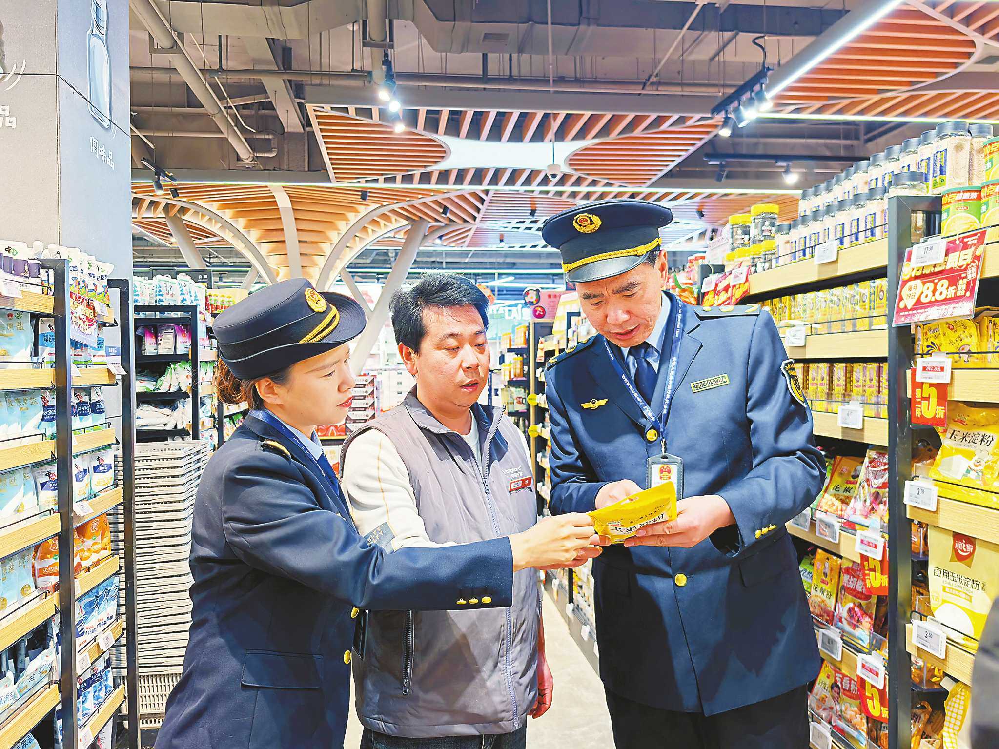 连日来,陕西省宝鸡市市场监管综合执法支队深入当地集贸市场、商超等重点场所开展年货市场检查。图为1月15日,该支队执法人员在一家超市进行现场检查。 □陈喜军 李 莎/摄影报道