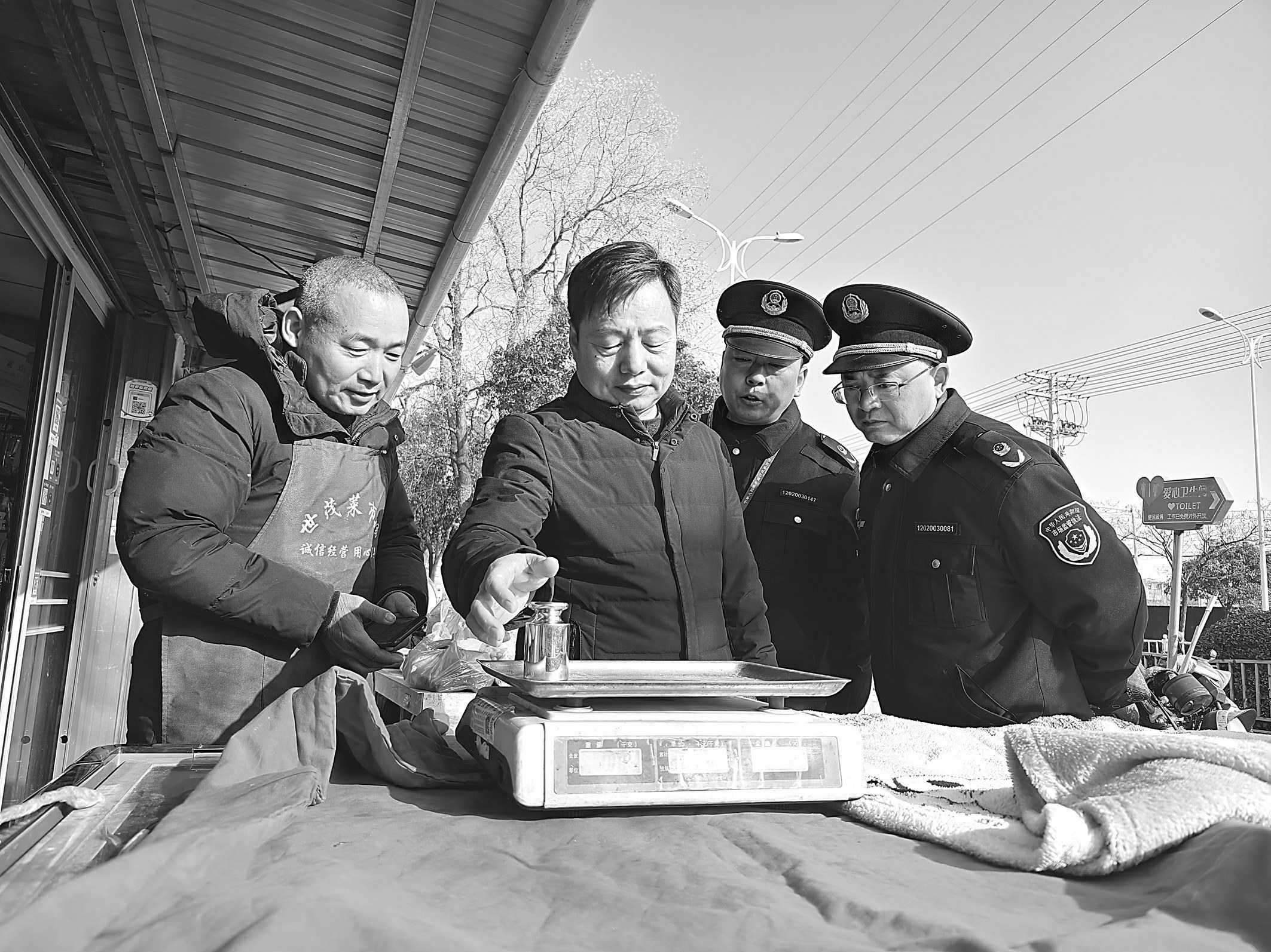 为规范市场计量秩序,安徽省淮北市市场监管局近日组织执法人员深入大型超市、集贸市场等场所,开展电子秤专项监督检查,重点检查经营户是否对电子秤依法检定、是否存在计量作弊行为。执法人员还对现场称重商品随机复核,确保交易“秤”准量足。图为1月19日,执法人员在集市门口检查电子秤。 □常 慕 张 珺/摄影报道