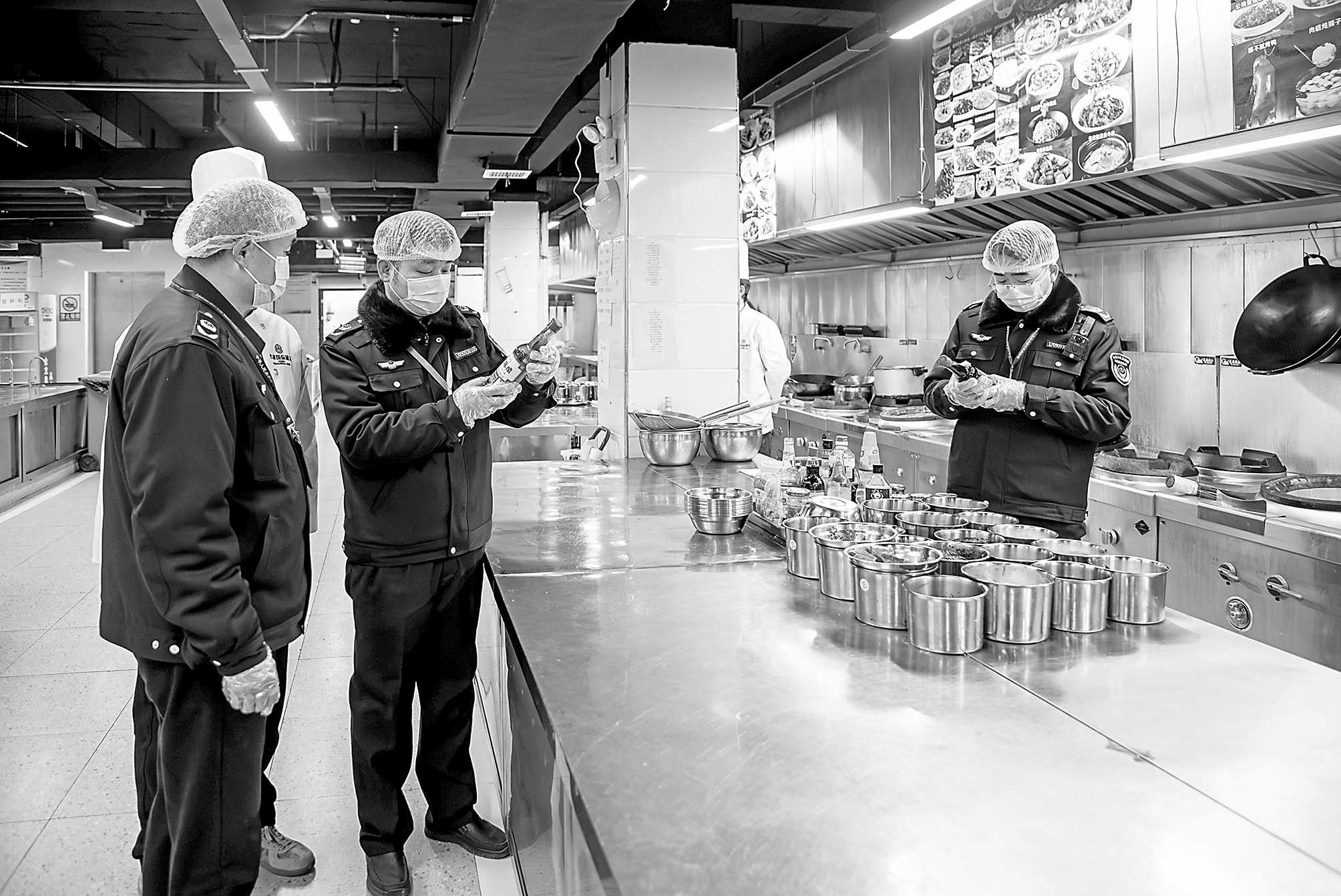 ▲连日来,湖北省红安县市场监管局开展春节喜宴、团年饭价格和食品安全专项检查。执法人员针对各大酒店提供预订的喜宴、团年饭套餐价格进行检查,查看经营者是否明码标价,是否与消费者签订合同或协议,是否存在捆绑消费、强制消费行为。同时,加强对食品加工操作流程、工作人员健康证件情况的检查,维护良好的节日消费环境。图为2月4日,执法人员在一家酒店的后厨检查。 □曾宪锋/摄